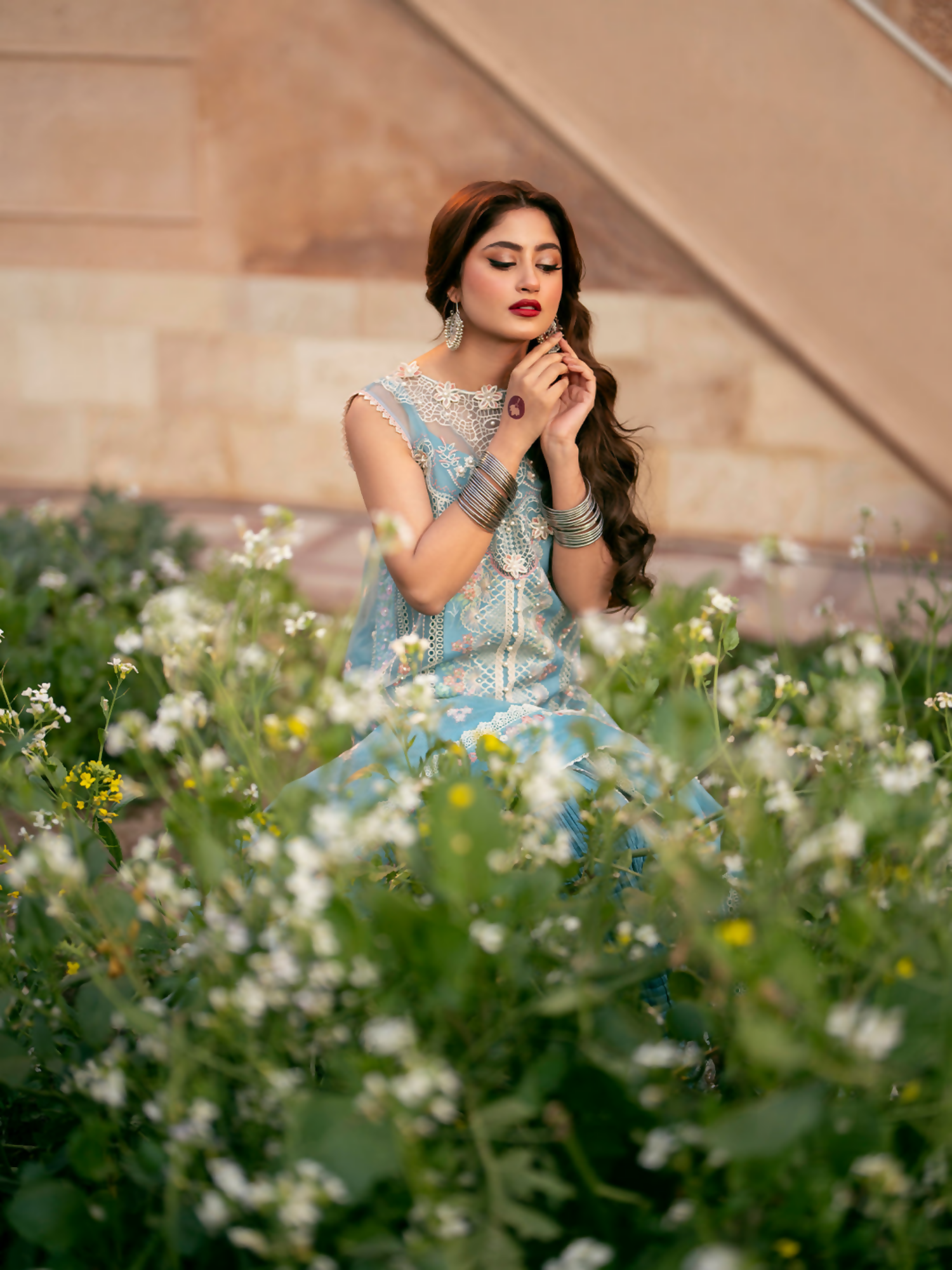 This Bin Ilyas unstitched 3-piece suit showcases intricate embroidery combined with contemporary style. The shirt features beautifully embroidered front and back panels on dyed organza, complemented by embroidered sleeves and daman lace. Detailed embroidery on the front center panel, neckline, and sleeves, along with 24 embroidered 3D flowers, adds depth and elegance. The dyed net embroidered dupatta with decorative palos and a dyed cotton trouser complete the ensemble, creating a graceful look ideal for festive and formal occasions.
