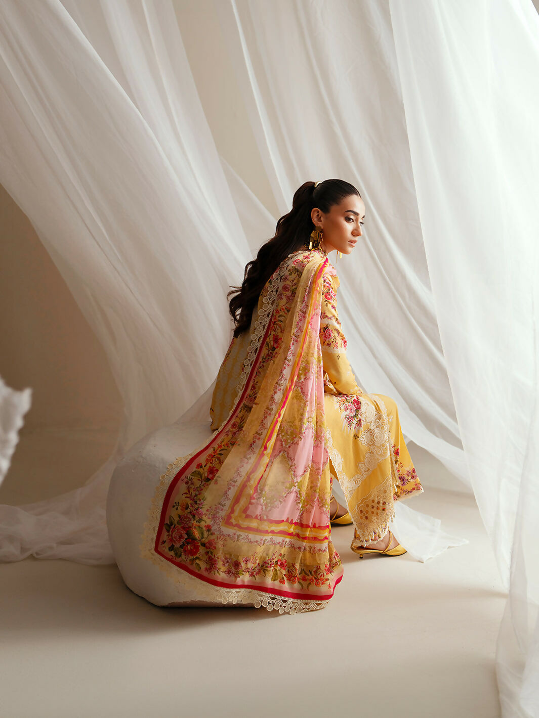A vibrant 3-piece stitched suit featuring a printed viscose shirt with delicate organza embroidery, paired with matching trousers and a printed chiffon dupatta for a stylish and elegant look.
