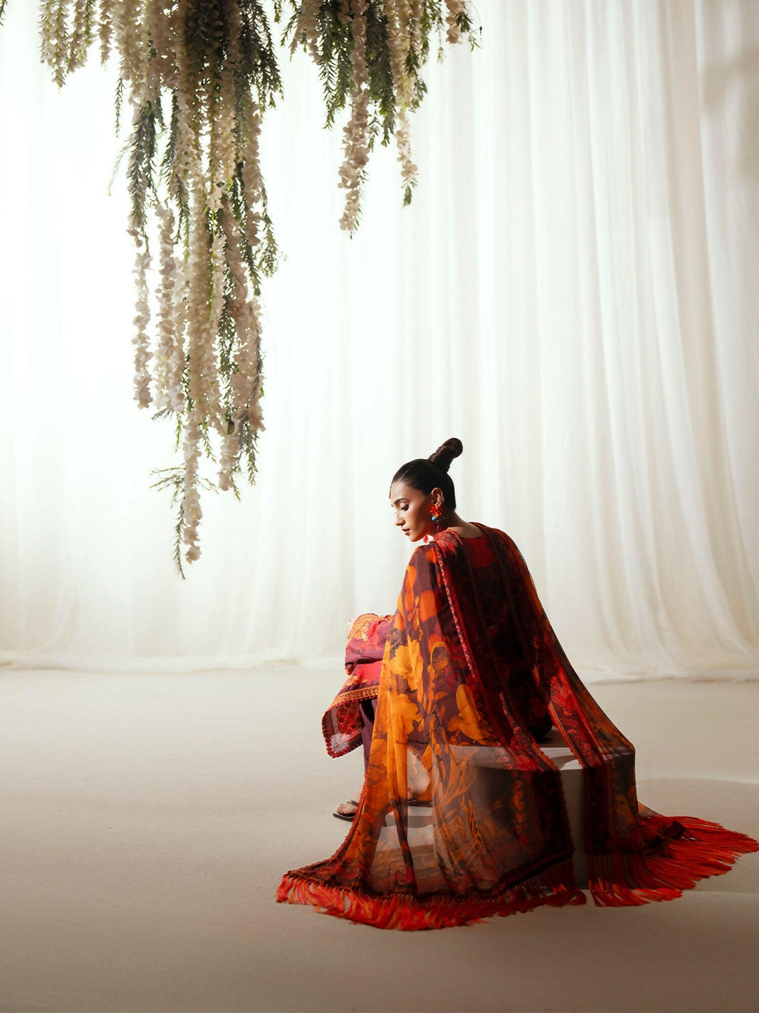 A vibrant embroidered viscose outfit paired with matching trousers and a digitally printed chiffon dupatta. This 3-piece stitched suit blends modern prints with delicate embroidery for an elegant and stylish look.