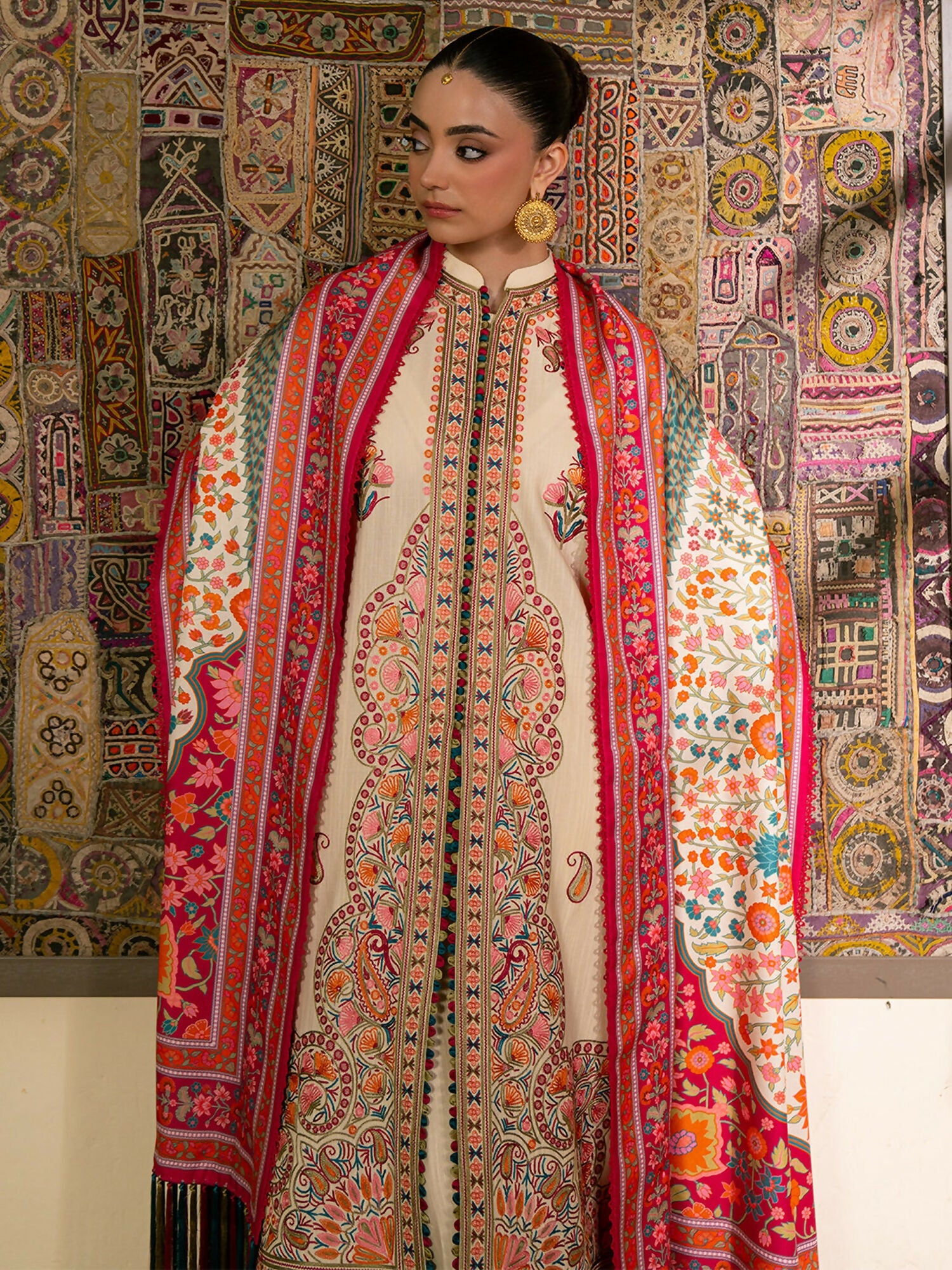 This elegant embroidered ensemble blends traditional artistry with modern charm. The beige shirt showcases vibrant multi-color embroidery inspired by ethnic motifs, beautifully complemented by a bold digital printed wool shawl. Paired with delicately detailed trousers, this outfit delivers a refined and graceful look.