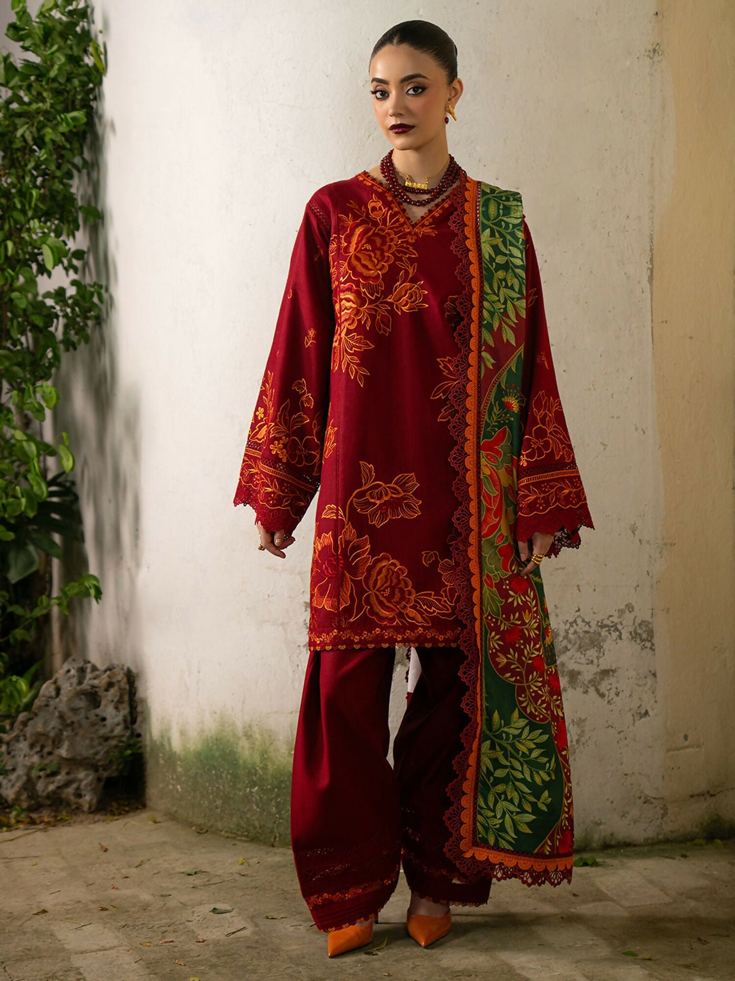 Make a bold statement this winter with this vibrant unstitched khaddar ensemble in a rich deep red tone. The shirt features intricately embroidered center, left, and right panels enhanced with detailed sleeves and daman lace for a refined finish. Paired with a striking digital printed wool shawl and a soft plain khaddar trouser, this outfit offers warmth, comfort, and standout style—perfect for festive and winter gatherings.