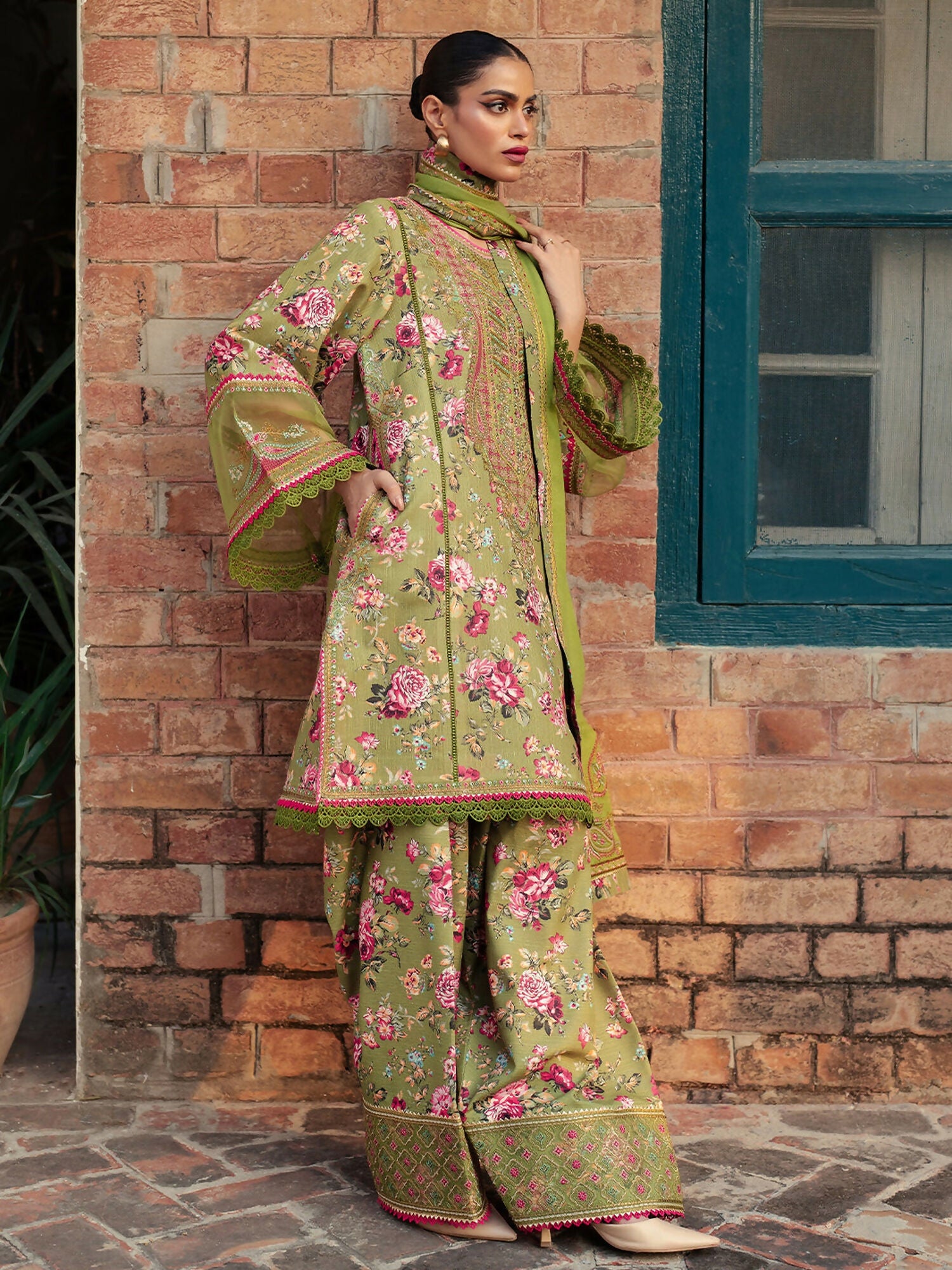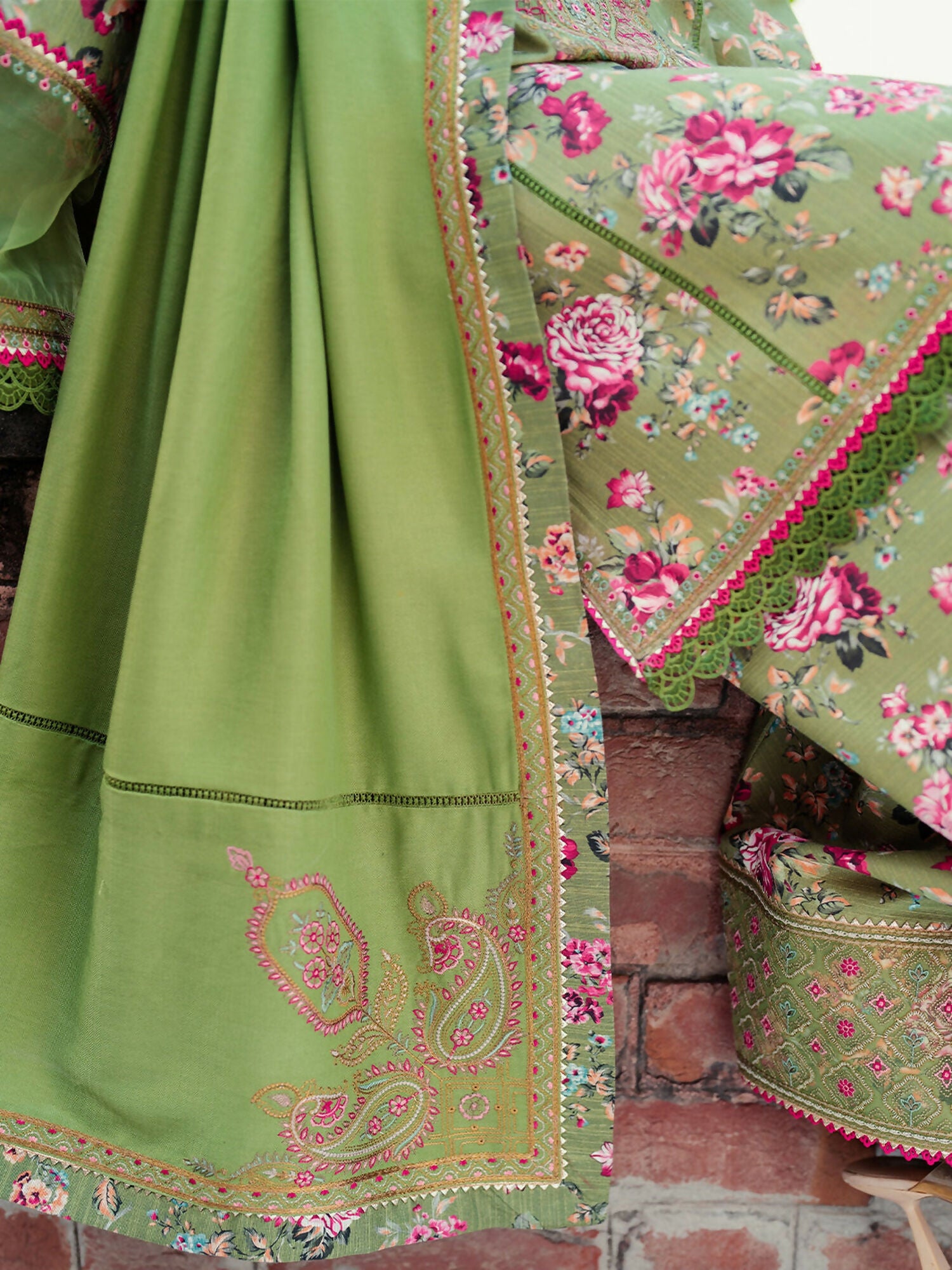 A stylish khaddar ensemble featuring intricate embroidery on organza and a warm wool shawl, paired with a printed shirt and trouser — perfect for an elegant winter look.
