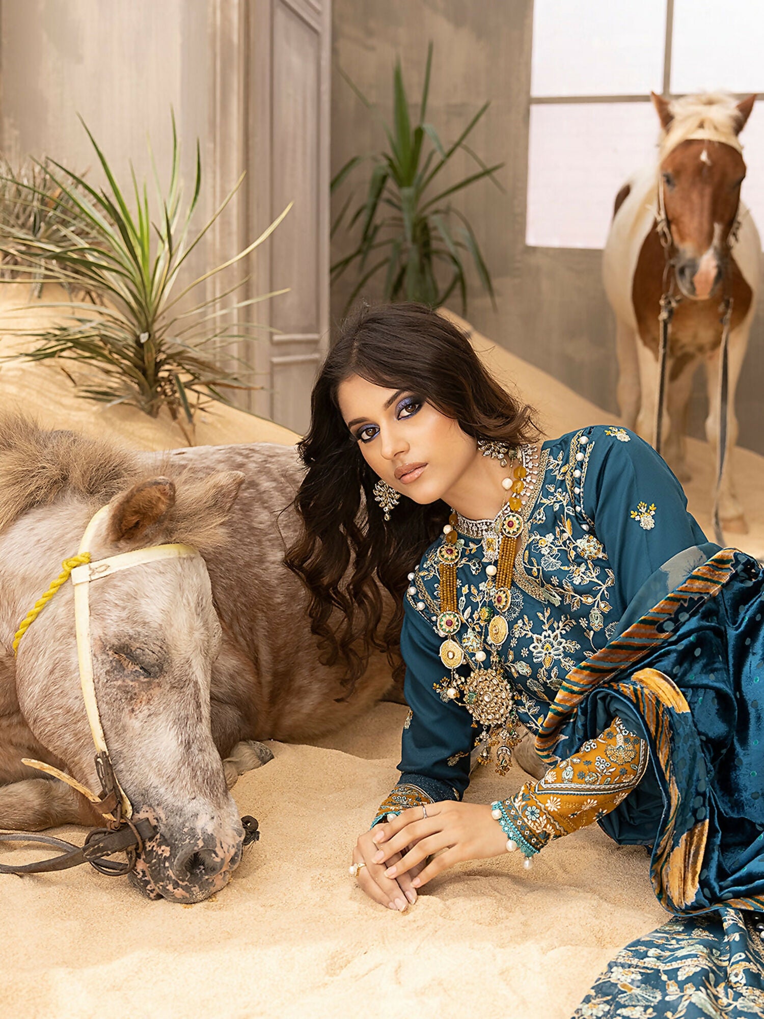 An elegant winter ensemble crafted with intricate embroidery and refined detailing. The beautifully worked front panels and sleeves exude sophistication, paired with a soft plachi shawl and dyed trouser that enhance both comfort and style — a perfect blend of warmth and grace.