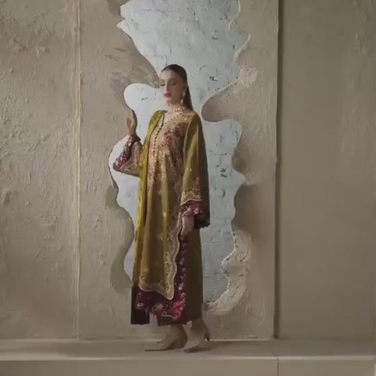 A stylish unstitched 3-piece suit by Bin Ilyas, combining a dyed Kotrai embroidered shirt, a plain Kotrai trouser, and a Palachi shawl. Perfect for elevating festive and semi-formal looks.
