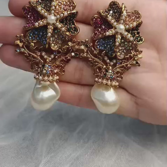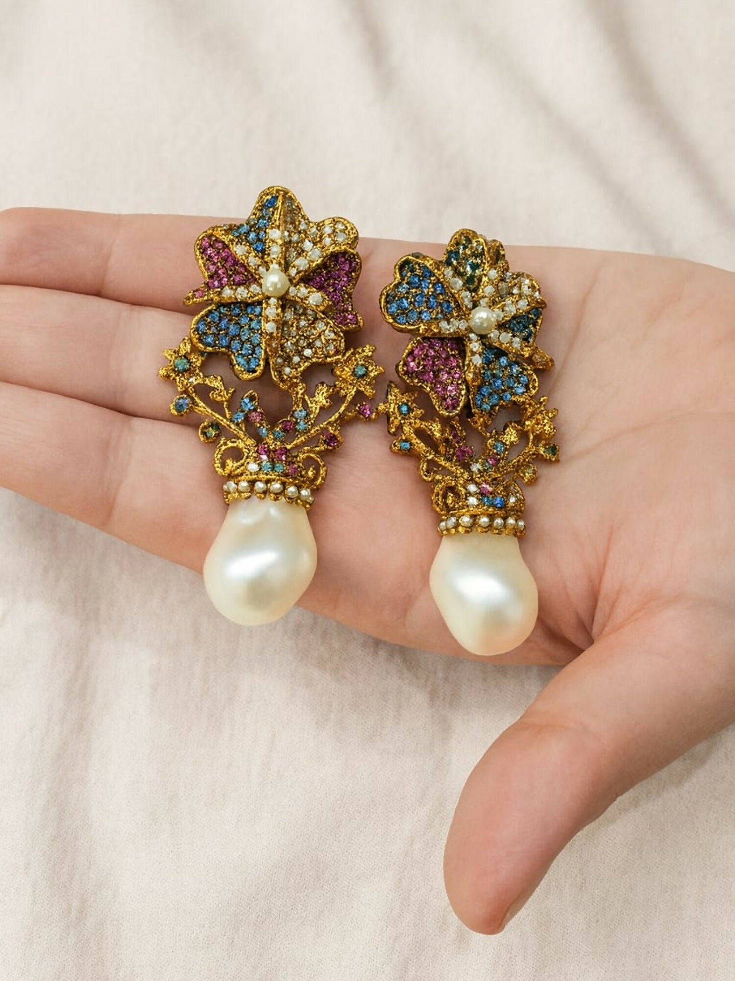 Durwaj Jewellery presents elegance in full bloom.These exquisite floral pearl drops are a celebration of color and craftsmanship — adorned with radiant stones in hues of blue, pink, and gold, finished with a graceful pearl droplet. Perfect for weddings, or when you simply want to shine with timeless grace.Where Fashion Meets Luxury.