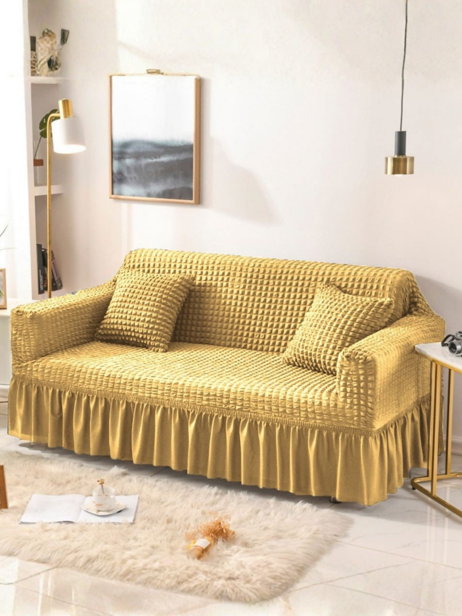 Elegant Bedding presents the Jersey Bubble Sofa Cover in a stunning yellow shade, crafted from premium stretch Jersey fabric. Its soft bubble texture and graceful skirt design add a modern, elegant touch while protecting your sofa from dust, stains, and spills.