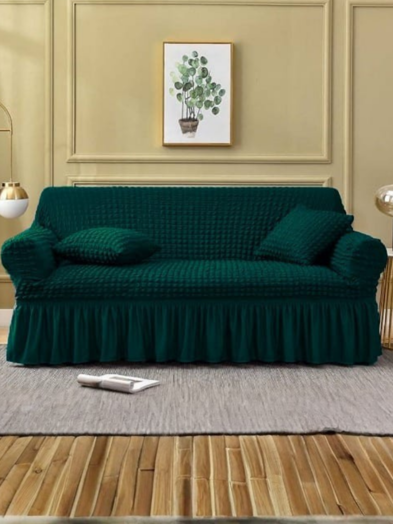 Elegant Bedding presents the Jersey Bubble Sofa Cover in a stunning green shade, crafted from premium stretch Jersey fabric. Its soft bubble texture and graceful skirt design add a modern, elegant touch while protecting your sofa from dust, stains, and spills.