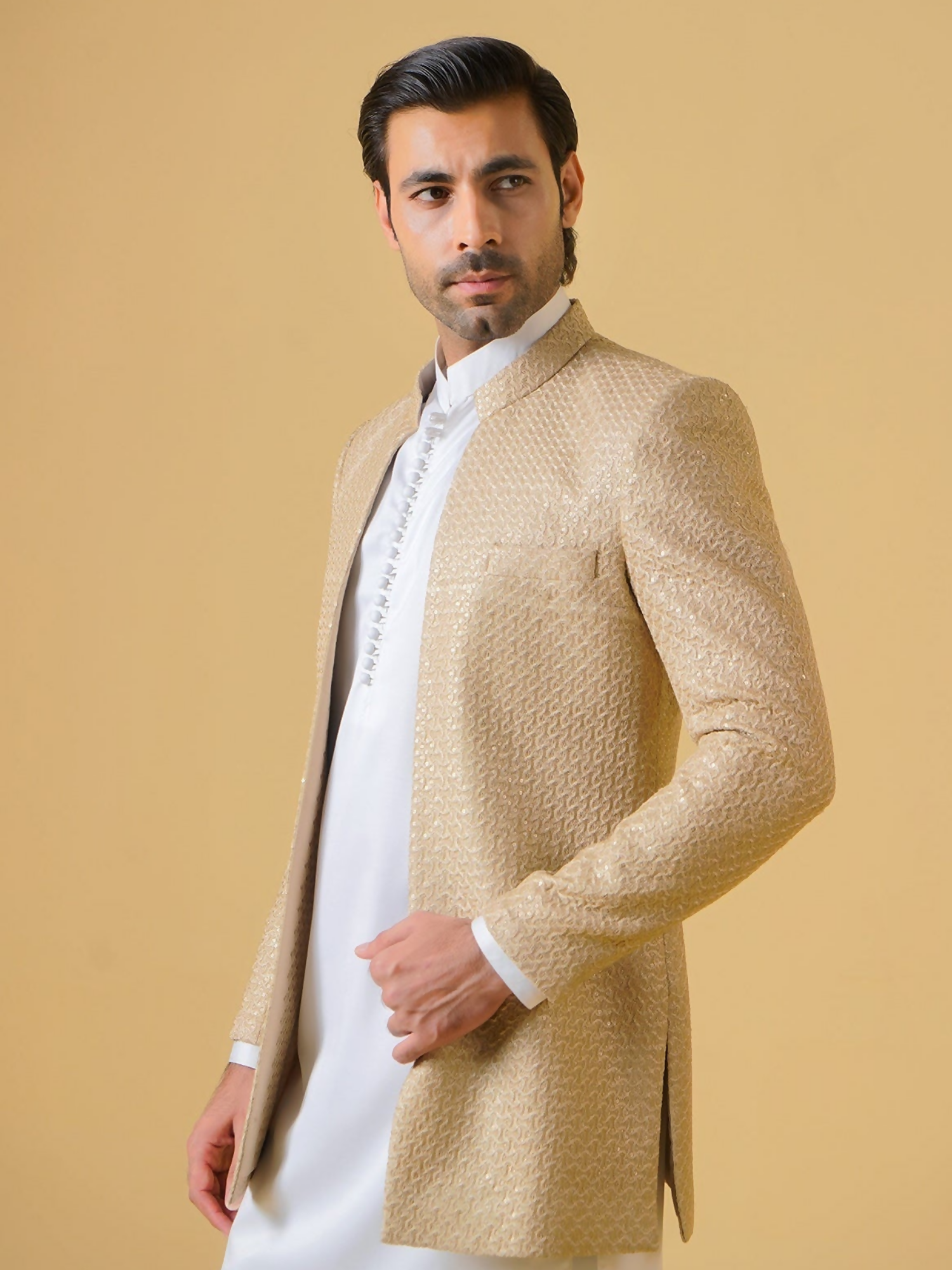 Naqsh is a statement prince coat crafted from luxurious raw silk in a radiant golden shade, designed for Pakistani formal wear with royal elegance and timeless appeal. Kurta and trouser are available separately in coordinating premium fabric.
