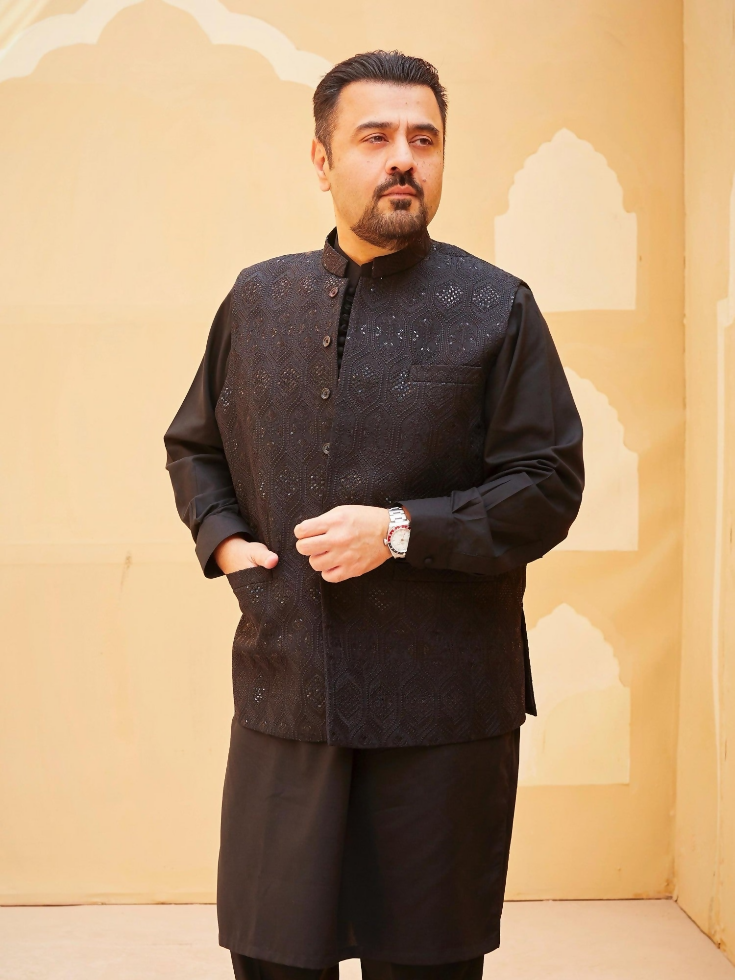 A black raw silk waistcoat crafted with refined tonal embroidery, offering timeless elegance for Pakistani formal wear. Designed in a regular-fit single-layer silhouette, this piece is ideal for nikah, baraat, and reception occasions, blending understated luxury with classic tailoring.