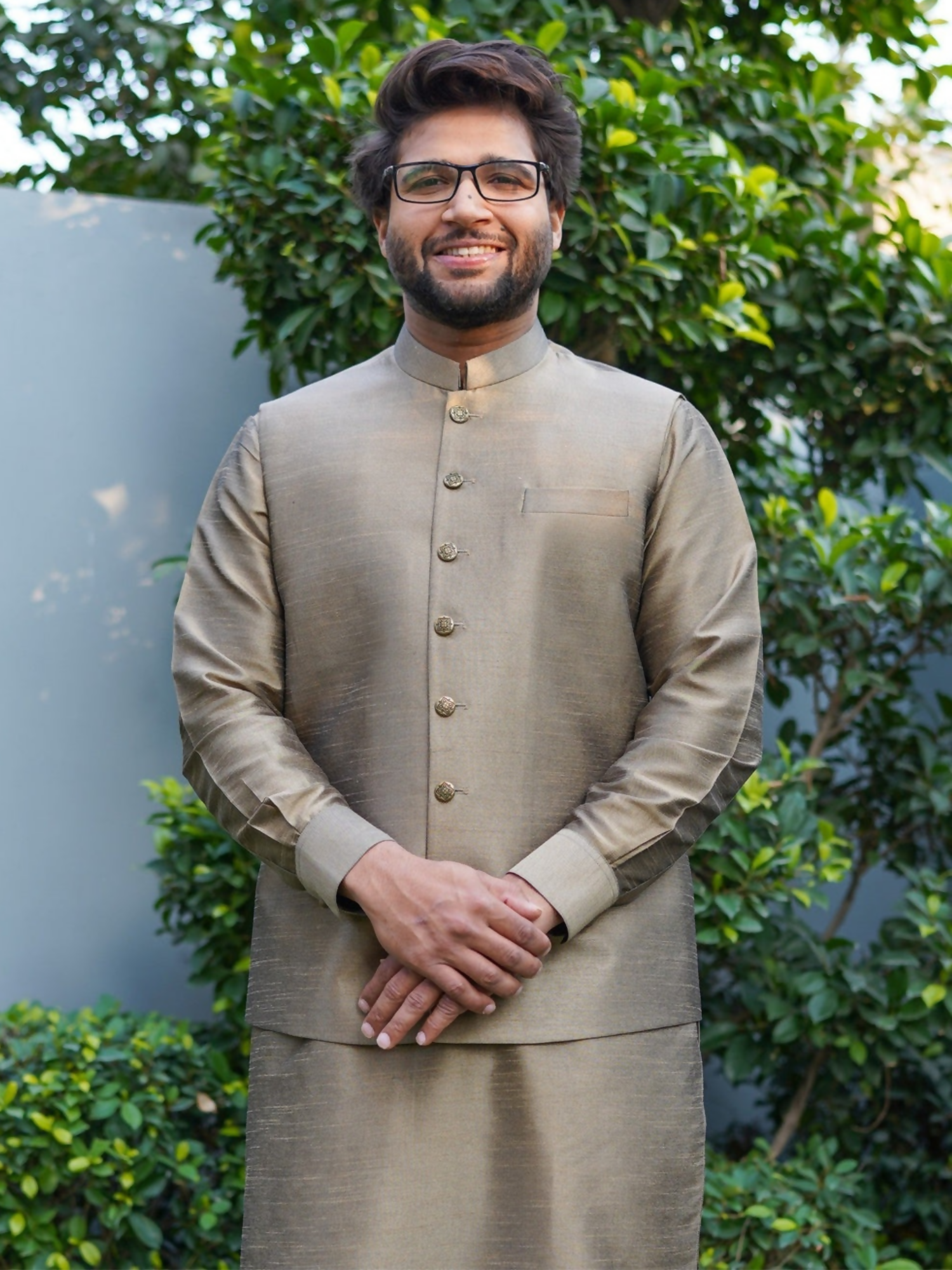 Waistcoat: Raw silk waistcoat featuring a refined natural texture, breathable comfort, clean structured tailoring, and premium craftsmanship that adds understated luxury to both traditional and contemporary formal ensembles.
