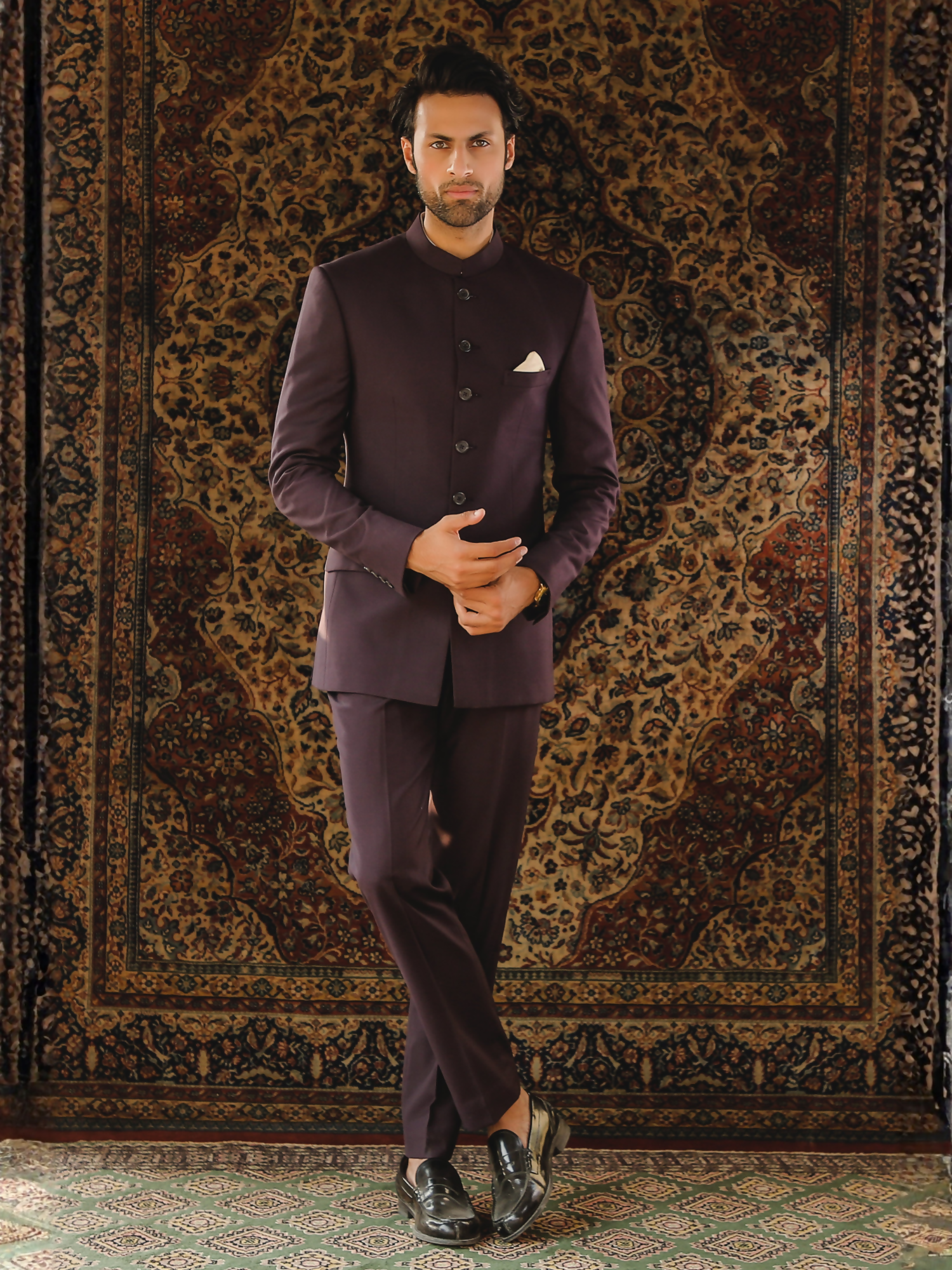 Crafted from premium tropical fabric, this sleek plum prince coat set is designed for Pakistani formal wear, offering contemporary royal styling, premium tailoring, and limited-edition designer sophistication.
