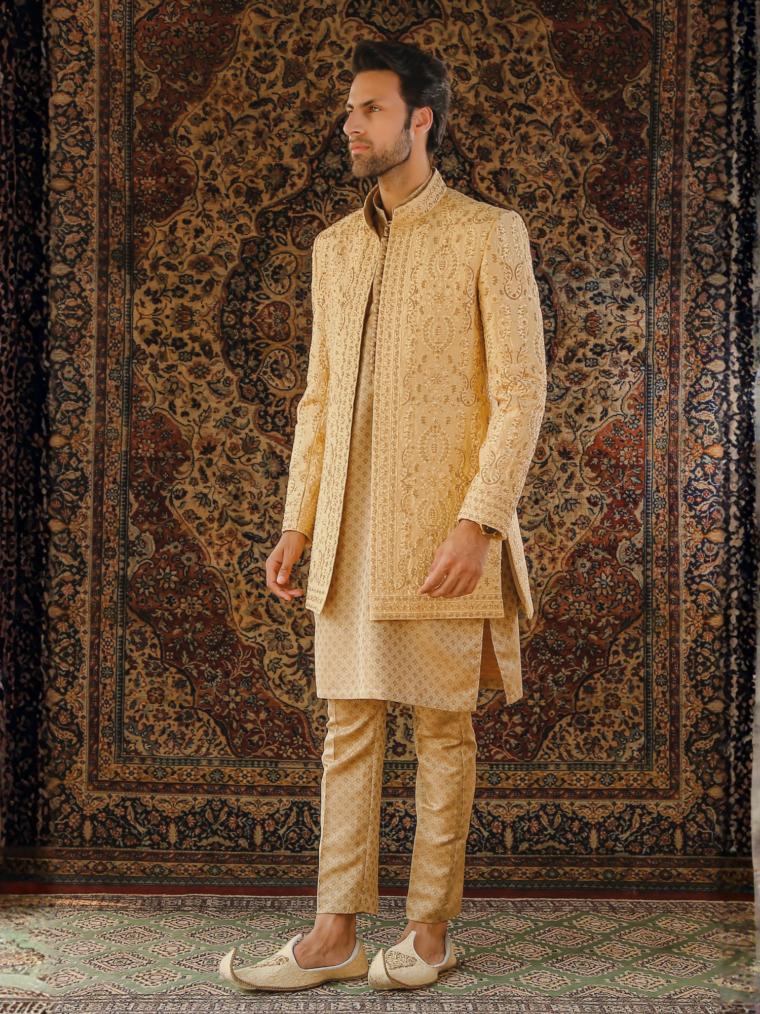 Prince Coat: Golden raw silk Prince coat with a rich, lustrous texture, exquisite craftsmanship, and a tailored silhouette for a timeless regal look.