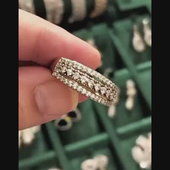 Elevate your elegance with this dual-tone band ring from H&A Jewellery. Featuring three rows of sparkling cubic zirconia stones and a sleek silver-and-gold finish, it’s perfect for both everyday wear and special occasions.