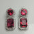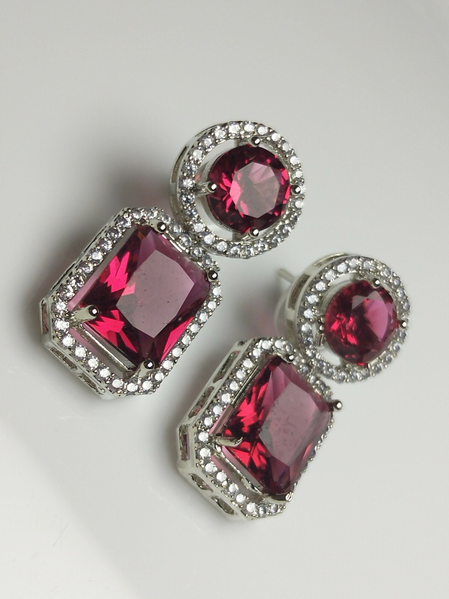 H&A Jewellery presents elegant drop earrings with a dual-stone design, accented by one carat semi-precious American diamond detailing.A round faceted ruby-red stone sits on top, encircled by a halo of clear white crystals. Dangling below, an emerald-cut red stone framed with sparkling semi-precious diamonds creates a regal look.