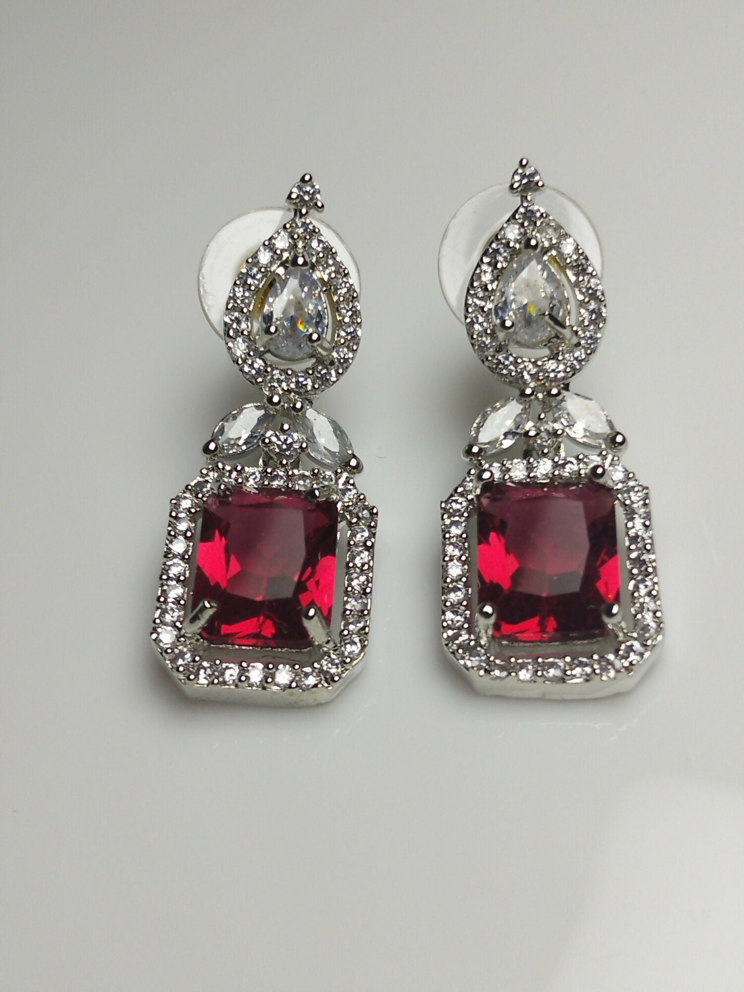 H&A Jewellery presents silver-tone drop earrings with a striking two-part design and one carat semi-precious American diamond accents. The top features a clear pear-cut stud surrounded by a sparkling halo of white crystals.A marquise-cut cluster connects to the bold ruby-red rectangular drop, framed by a double halo.