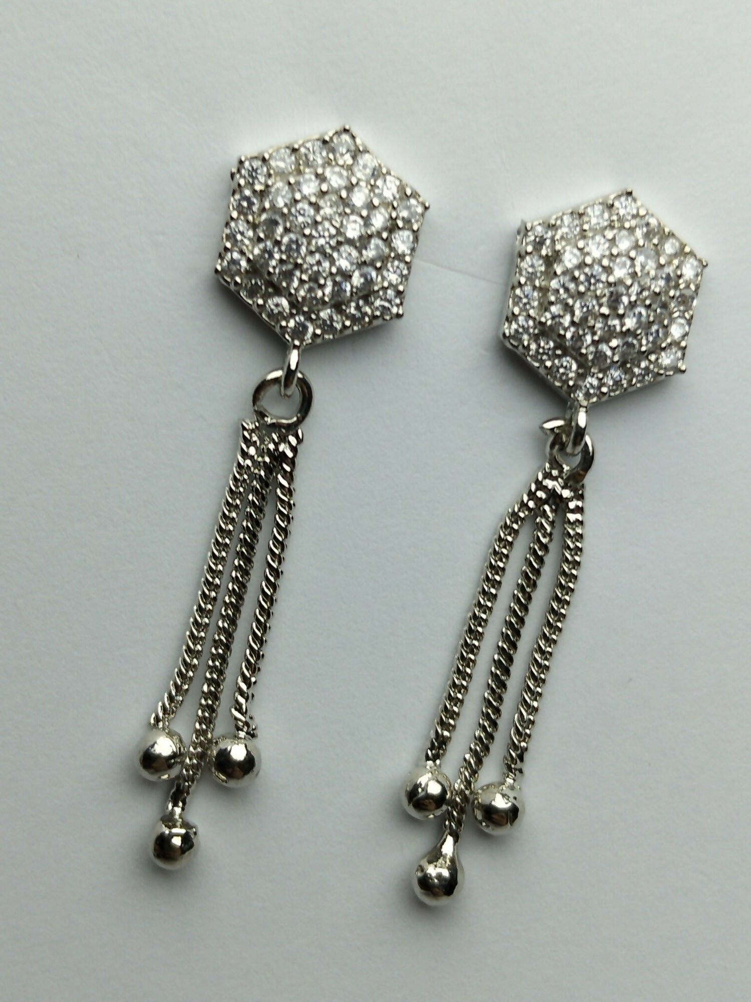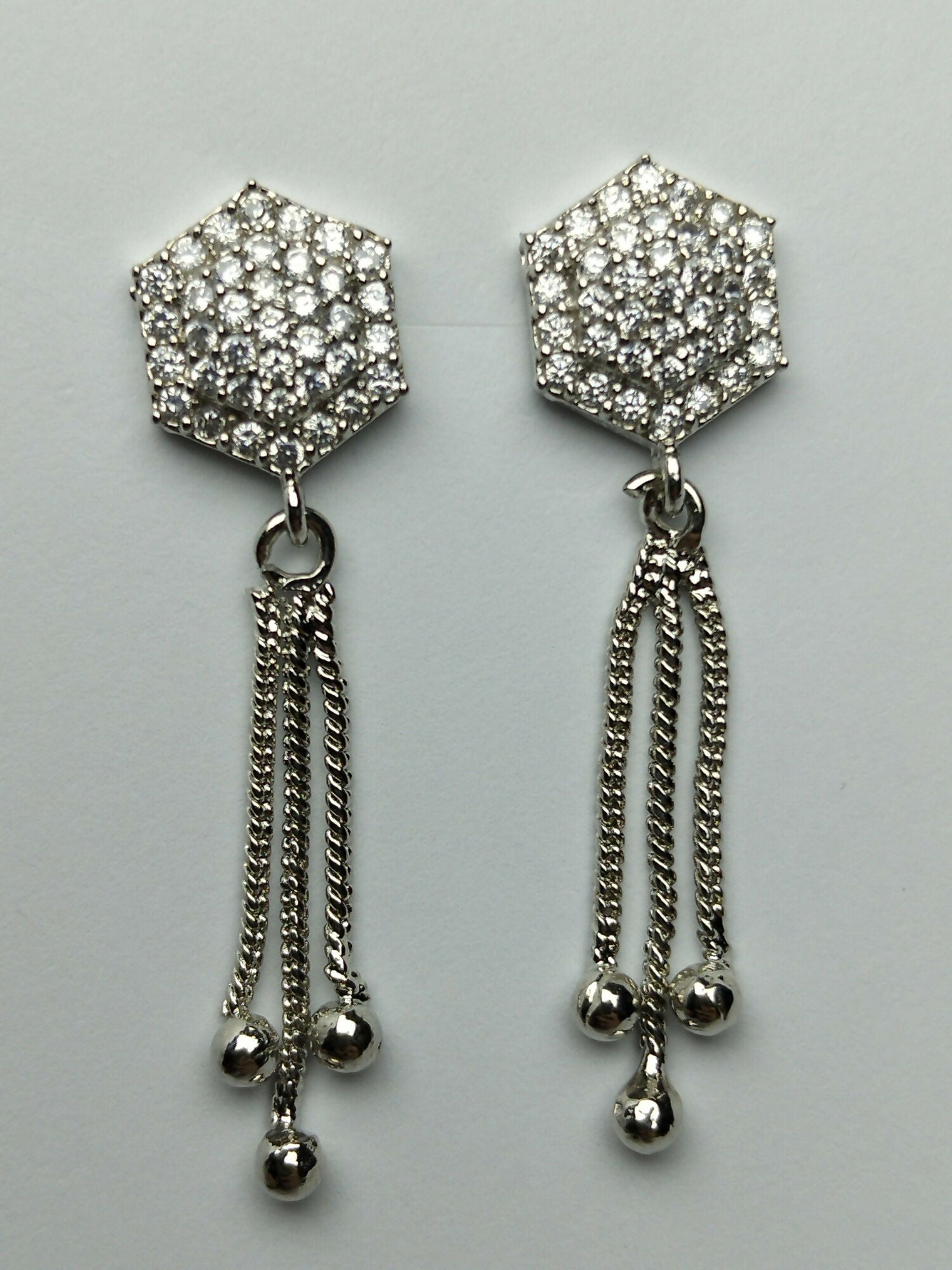H&A Jewellery presents unique dangle earrings with one carat semi-precious stones and an American diamond. Designed with a hexagonal stud encrusted with clear crystals and delicate chain drops, best for traditional and casual wear.