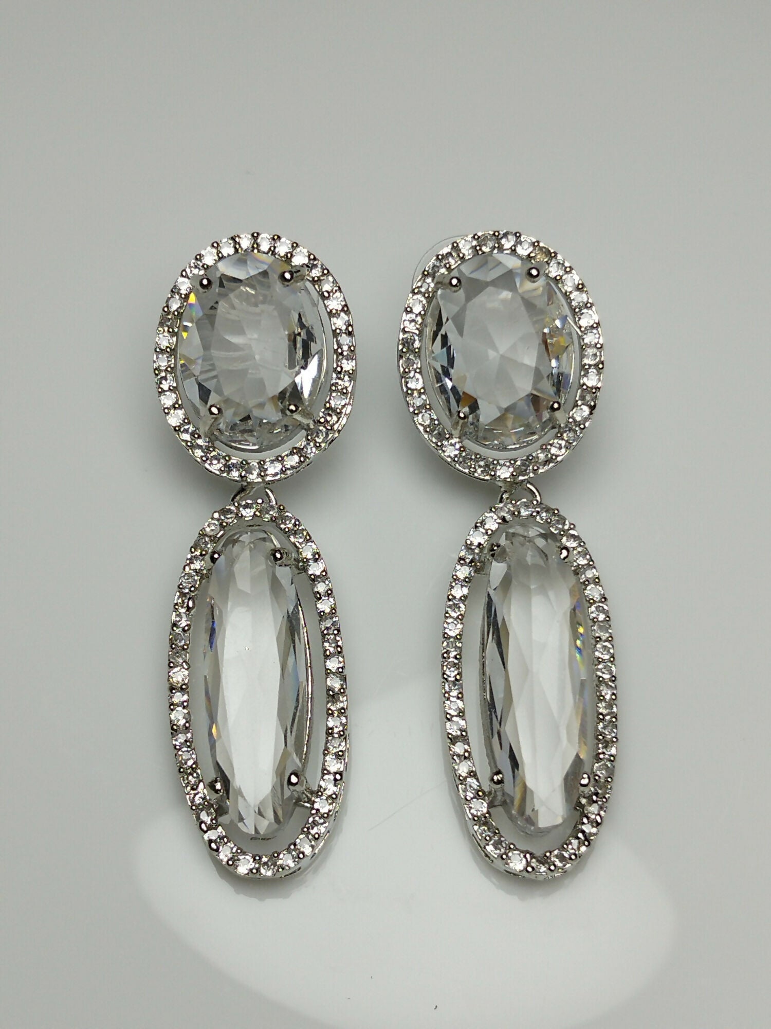 H&A Jewellery introduces these exquisite Statement Drop Earrings. They are one carat with semi-precious stones, American diamonds, featuring large, multi-faceted oval clear stones. The sophisticated silver finish and classic design make them an absolute essential for any formal event.