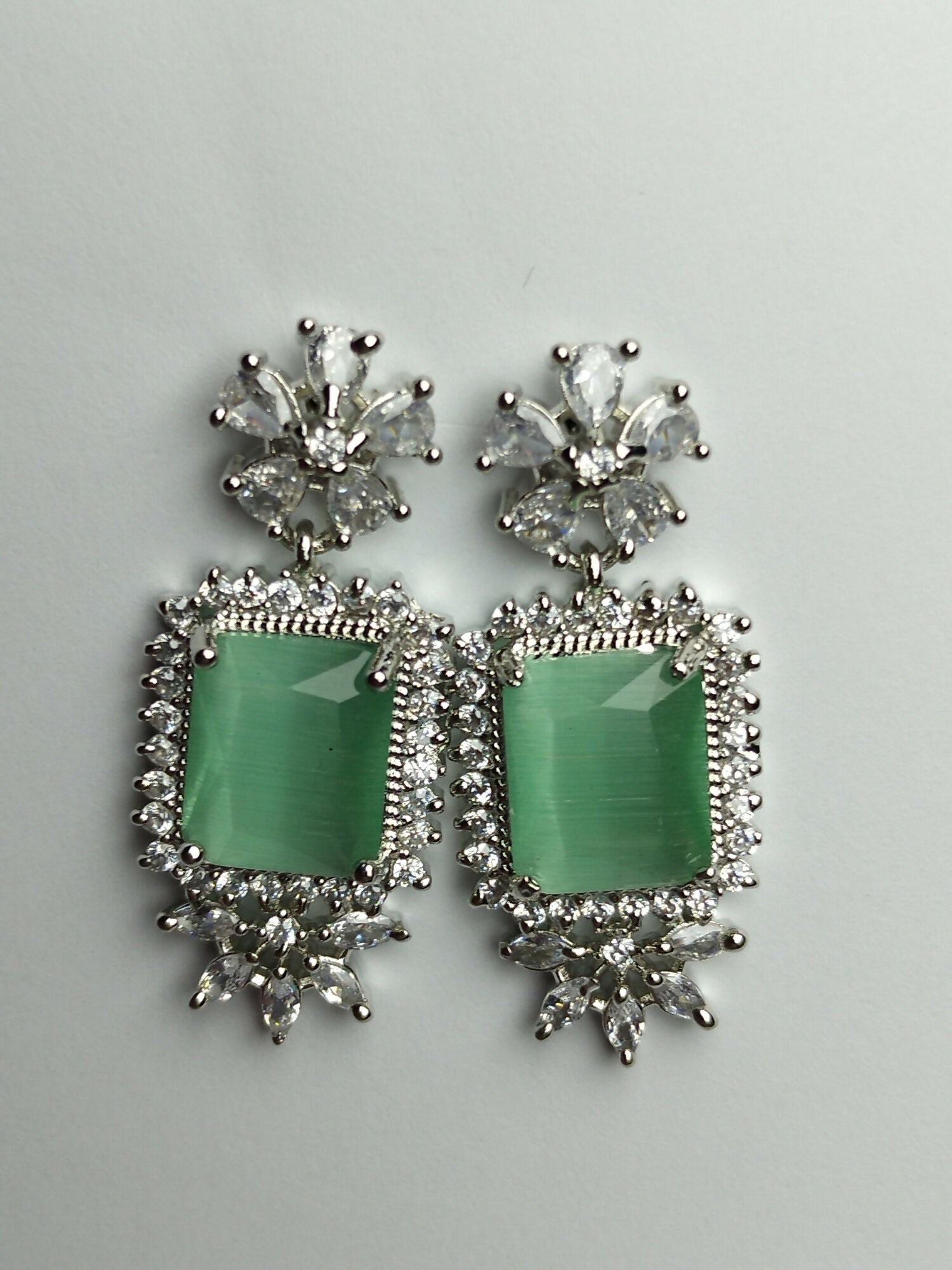 H&A Jewellery presents eye-catching drop earrings crafted in a silver-tone setting with one carat semi-precious American diamond accents.A sparkling floral stud of white cubic zirconia connects elegantly to the bold centerpiece. The rectangular mint-green stone, framed by a halo of clear stones, creates a glamorous statement.