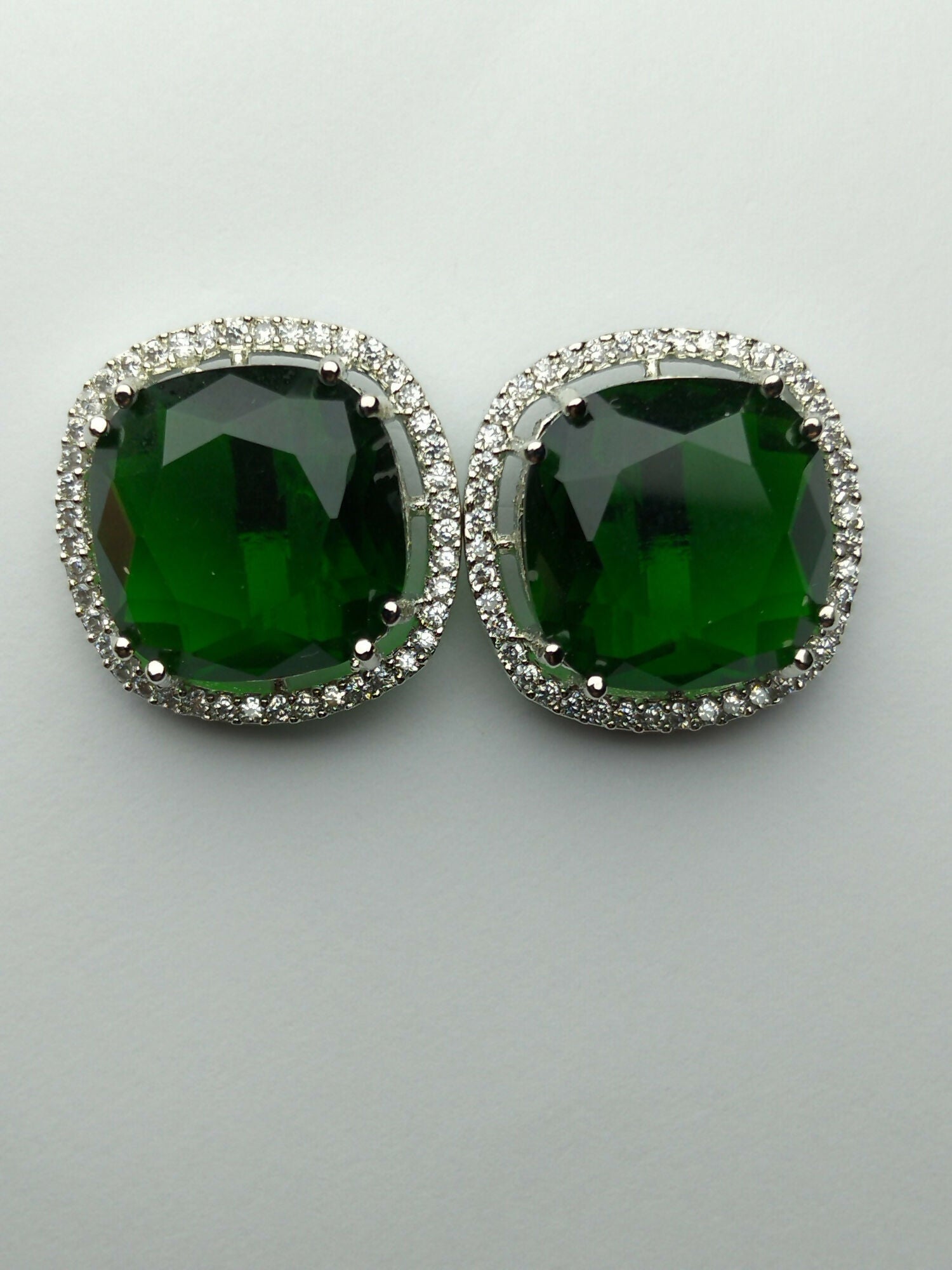 H&A Jewellery presents stunning stud earrings with one carat semi-precious stones American diamond. Featuring a cushion-cut emerald-green stone surrounded by a halo of clear crystals, best for traditional and casual wear.