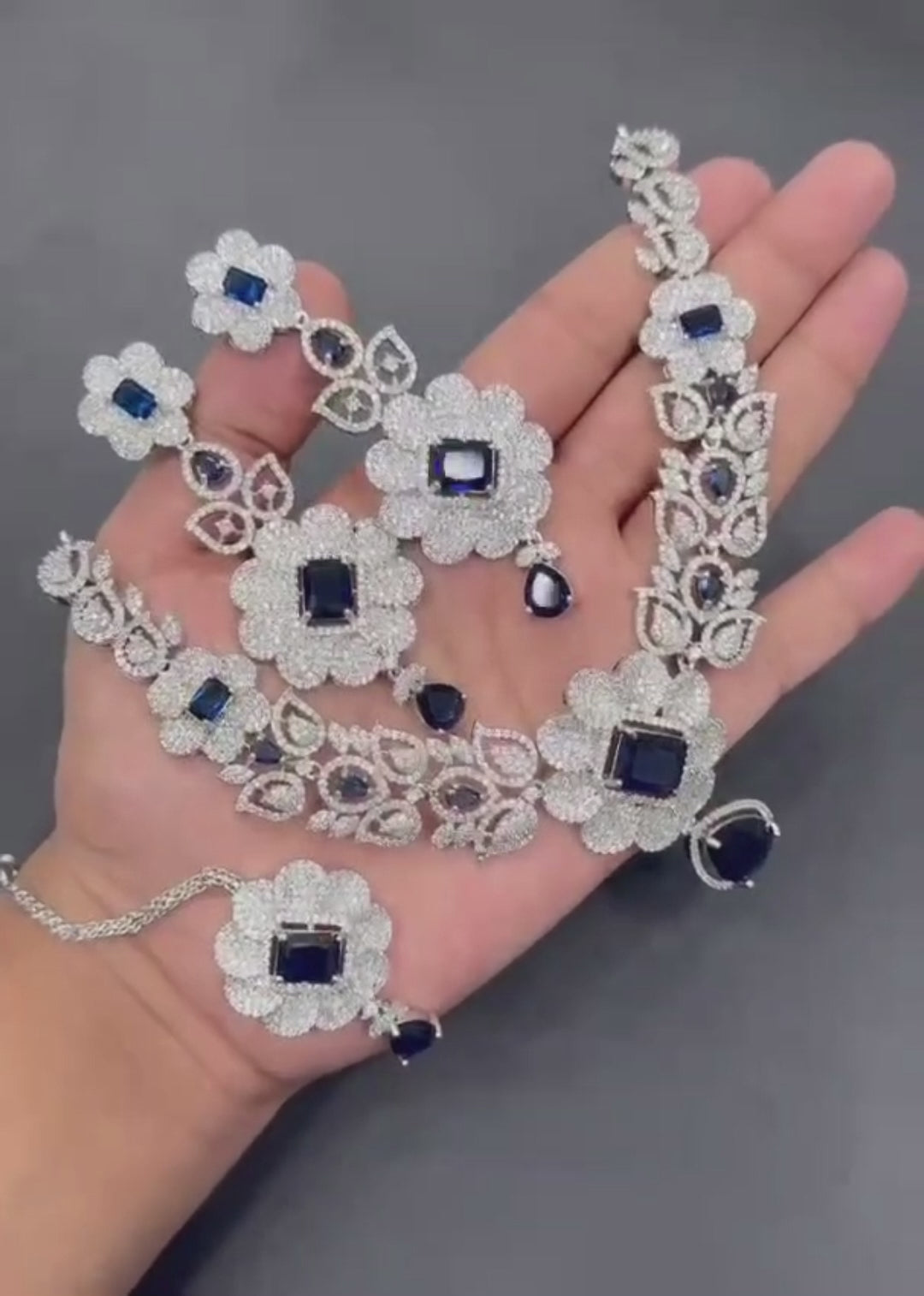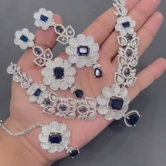H&A Jewlery One Carat Silver Rhodium-Plated American Diamond Semi-Precious Stone Set, crafted with precision and beauty. The blend of sparkling American diamonds and semi-precious stones adds timeless elegance. Perfect for enhancing your grace on every occasion.