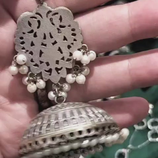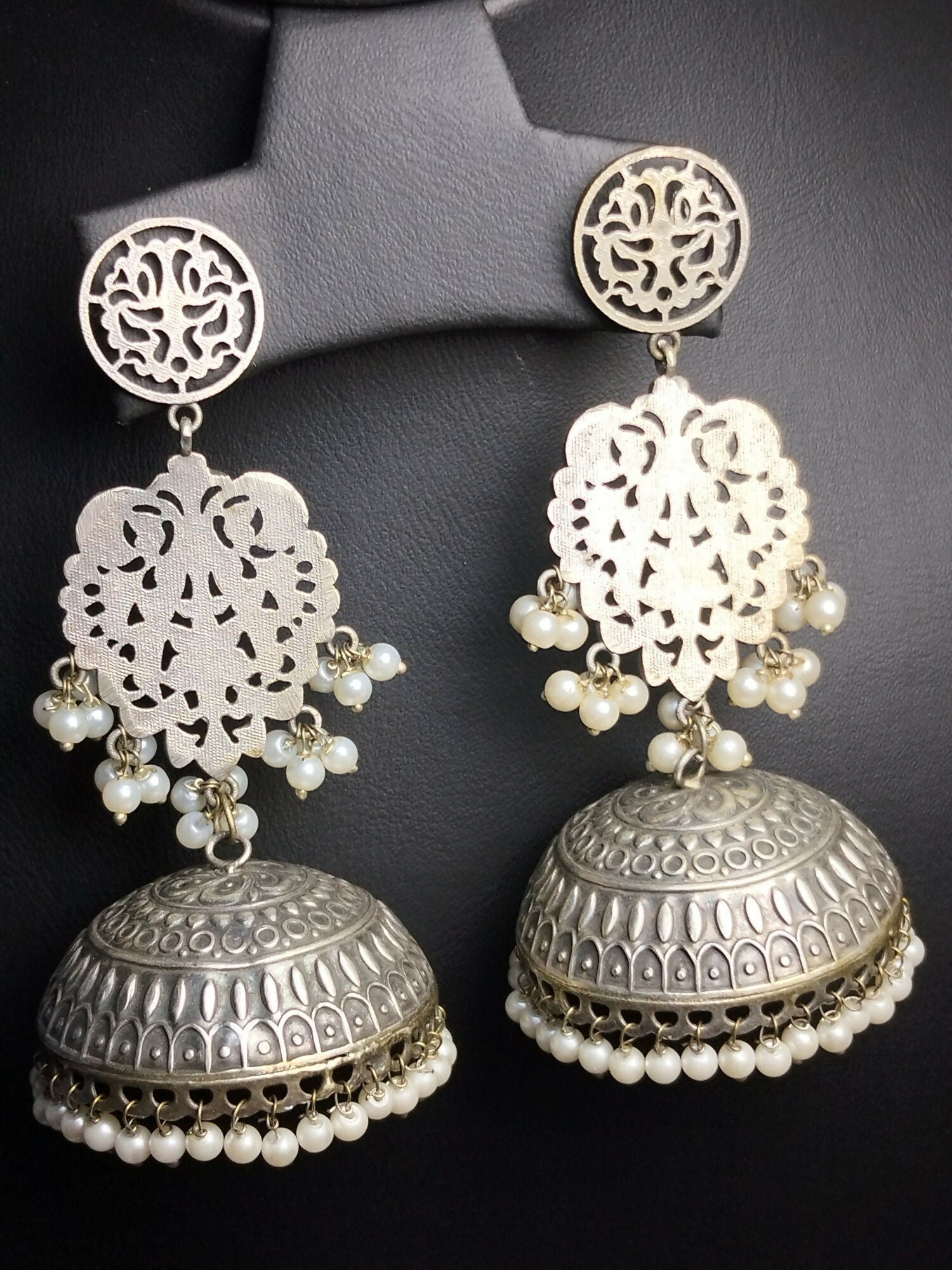 H&A Jewellery presents elaborate jhumka drop earrings. Crafted in oxidized silver tone and gunmetal finish with intricate filigree and pearl detailing, best for traditional and casual wear.