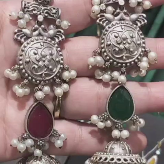 H&A Jewellery presents oxidized brass handmade earrings featuring intricate detailing and an antique silver-tone finish. Each earring showcases fine filigree work with a small Maroon stone set at the center, surrounded by delicate bead accents. Perfect for bohemian, festive, or traditional casual wear.