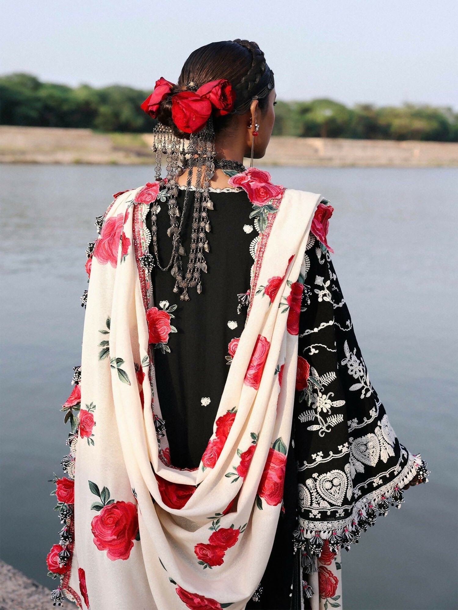 A vision of understated elegance, this unstitched black ensemble redefines the classic Karandi silhouette with modern refinement. The shirt is exquisitely adorned with delicate dori embroidery and panni details, radiating timeless charm. A graceful contrast is introduced through the ivory Karandi shawl, intricately embroidered with rose motifs, adding depth and sophistication. Completing the look is a matching black shalwar, accentuated with coordinating dori embroidery — a design that embodies effortless grace and regal poise.