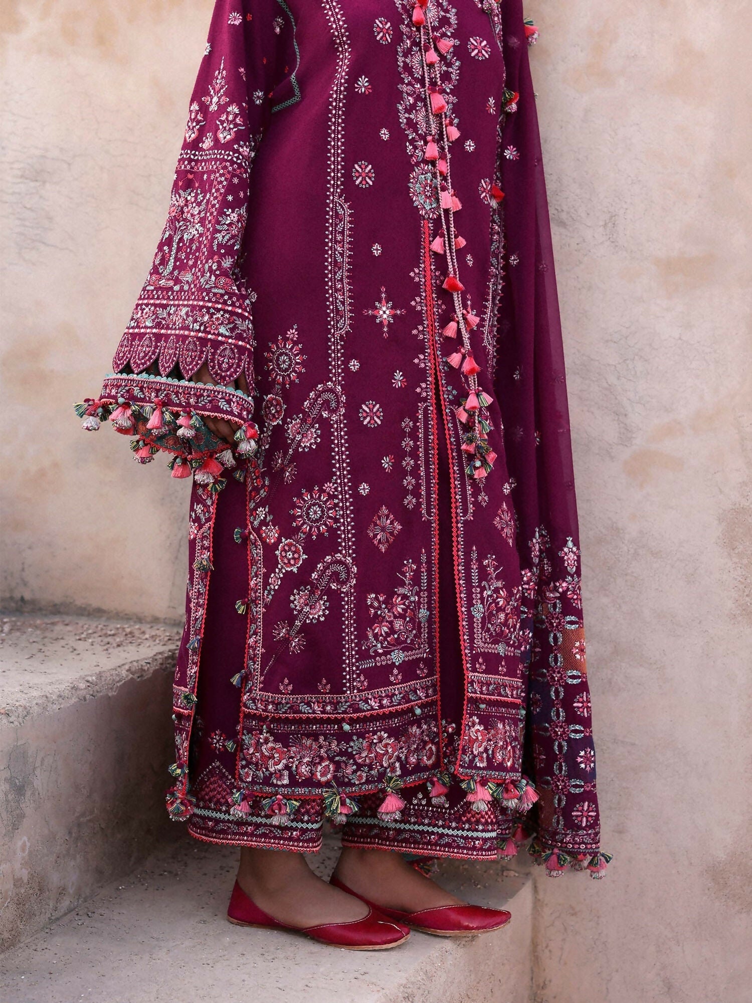 A magenta embroidered Karandi front-open shirt adorned with rich, multicolored embroidery on the neckline and hem, paired with beautifully detailed embroidered sleeves for an added touch of charm. The look is completed with embroidered culottes and a chiffon embroidered shawl, enhanced by a patched Karandi pallu featuring chic color-blocking and intricate jall detailing — each element reflecting a perfect harmony of luxury and tradition.