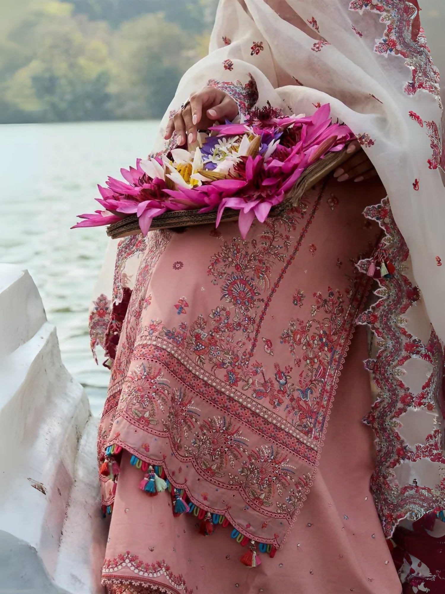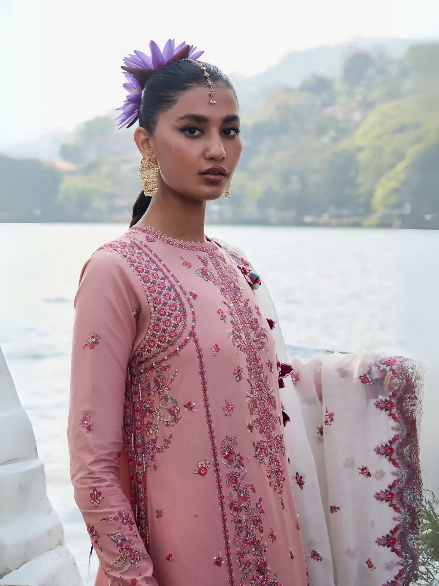 A rose pink ensemble presents a picturesque vision of modern elegance, enhanced by meticulously executed embroidery on lawn fabric. Alluring floral embroidery, featuring border detailing in summery hues, lends an ethereal quality. An ivory organza dupatta, adorned with intricate embroidery and a complementary border, completes the ensemble. This modern and dazzling silhouette is finished with coordinating rose pink embroidered trousers.