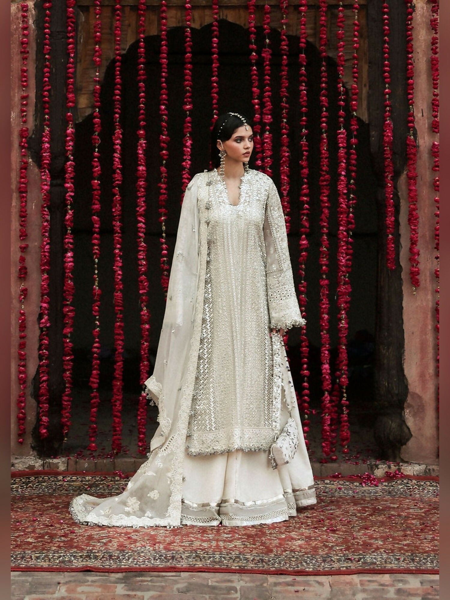 An elegant organza shirt is adorned with delicate embroidery on the panels and side embroidered sequin jaal, complemented by heavily embroidered sleeves that exude timeless charm. The chiffon dupatta with embroidered borders and organza pallu enhances the grandeur of the ensemble, while the Korean raw silk sharara adds graceful movement and a touch of sophistication. This outfit is the epitome of elegance, blending refined craftsmanship with classic allure.