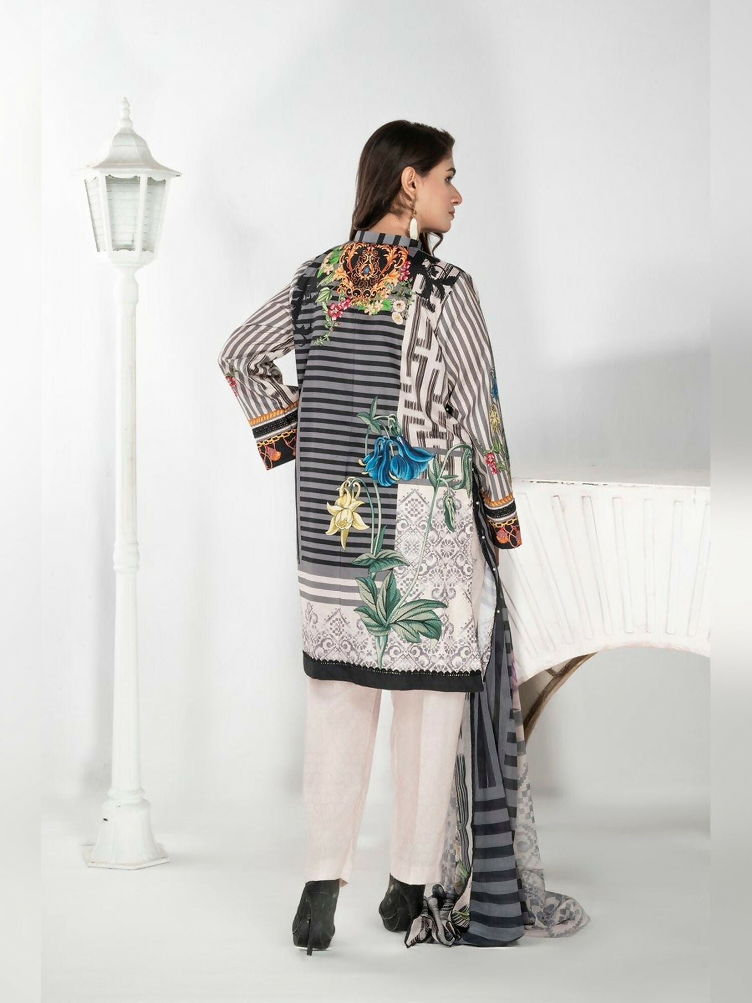 A stitched 3-piece suit featuring a digital printed lawn shirt, chiffon dupatta, and dyed lawn trouser, offering both comfort and style for your daily wardrobe.
