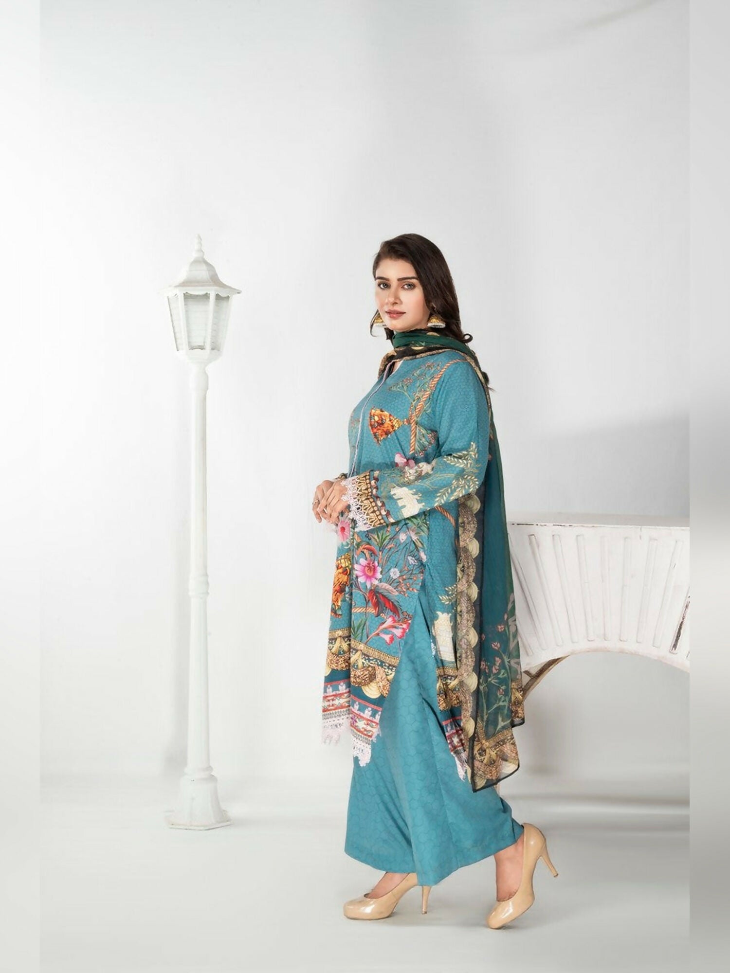A stitched 3-piece suit featuring a digital printed lawn shirt, chiffon dupatta, and dyed lawn trouser, offering both comfort and style for your daily wardrobe.