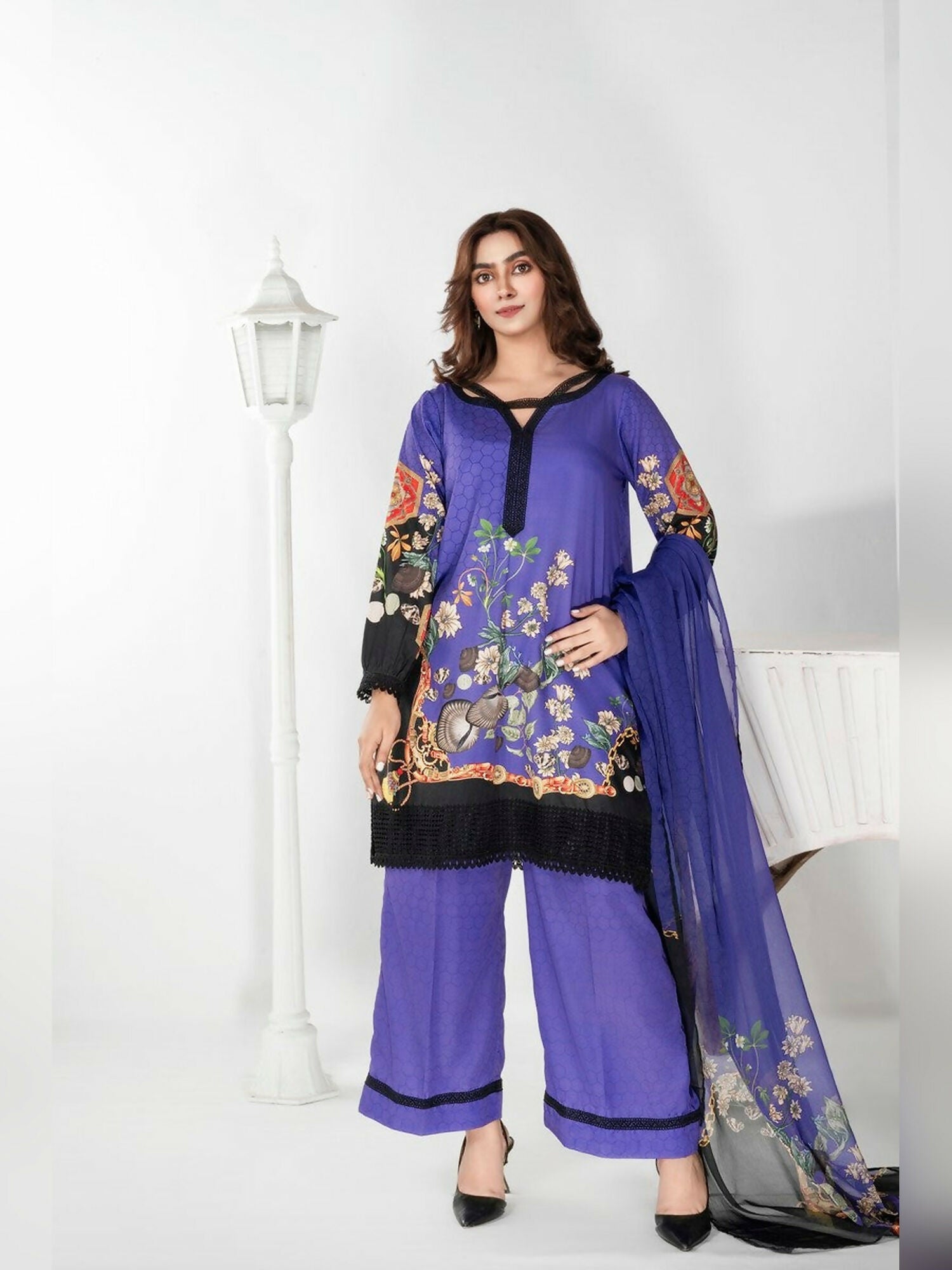 A unstitched 3-piece suit featuring a digital printed lawn shirt, chiffon dupatta, and dyed lawn trouser, offering both comfort and style for your daily wardrobe.