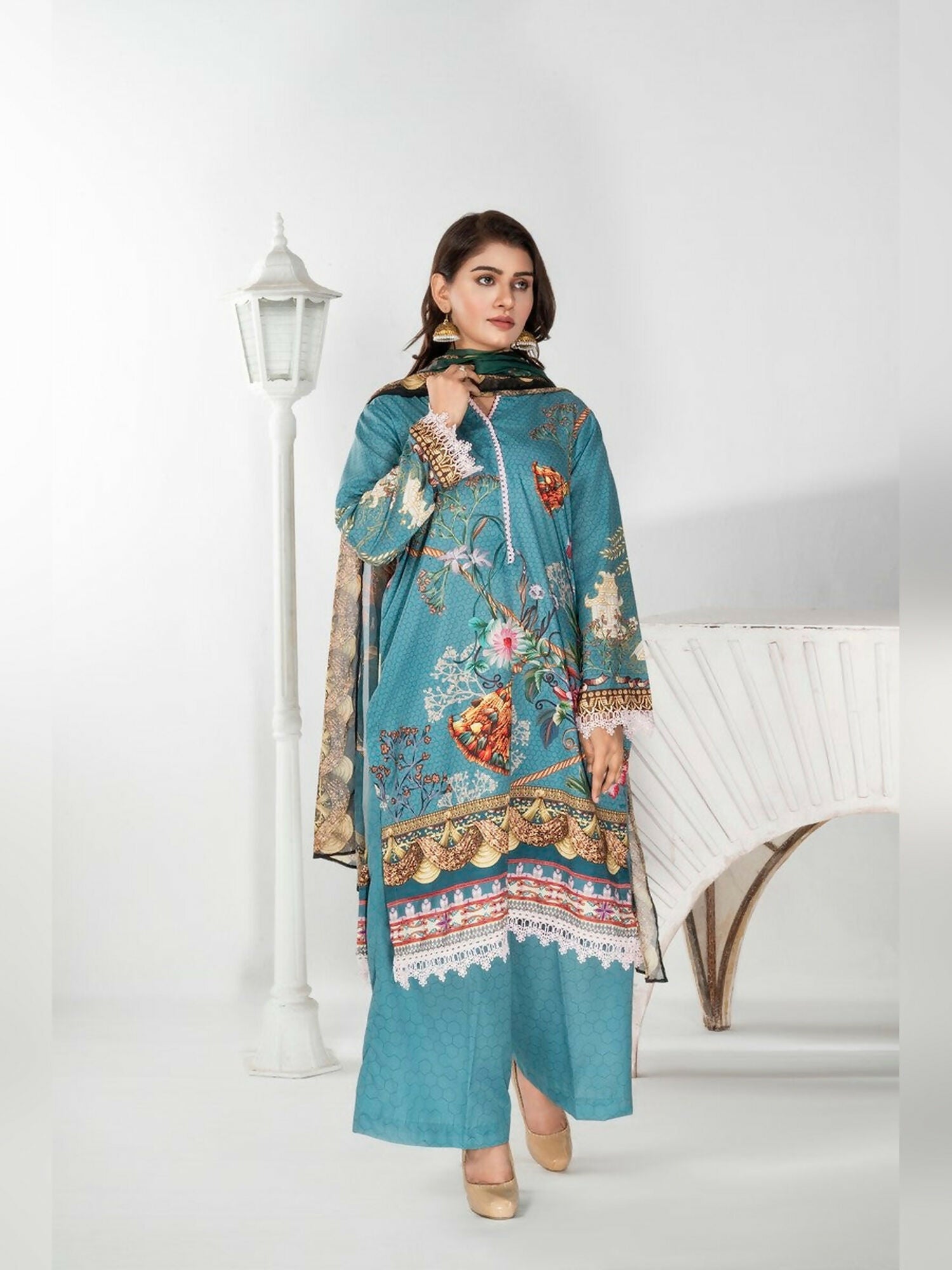 A unstitched 3-piece suit featuring a digital printed lawn shirt, chiffon dupatta, and dyed lawn trouser, offering both comfort and style for your daily wardrobe.