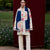 A contrasting blue scarf adorned with subtle embroidery that enhances the ivory outfit’s d...