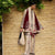 A striking maroon scarf featuring subtle embroidery that complements the beige outfit’s Ka...