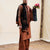 A black scarf beautifully accented with multicolor embroidery that echoes the shirt’s vibrant detailing. Its deep hue provides striking contrast, enhancing the richness of the burnt-orange ensemble and adding a touch of regal sophistication.