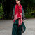 A red scarf adorned with intricate zari embroidery, radiating cultural charm and festive allure. Its rich tone and metallic threadwork beautifully complement the green outfit, adding a regal finishing touch to the traditional look.