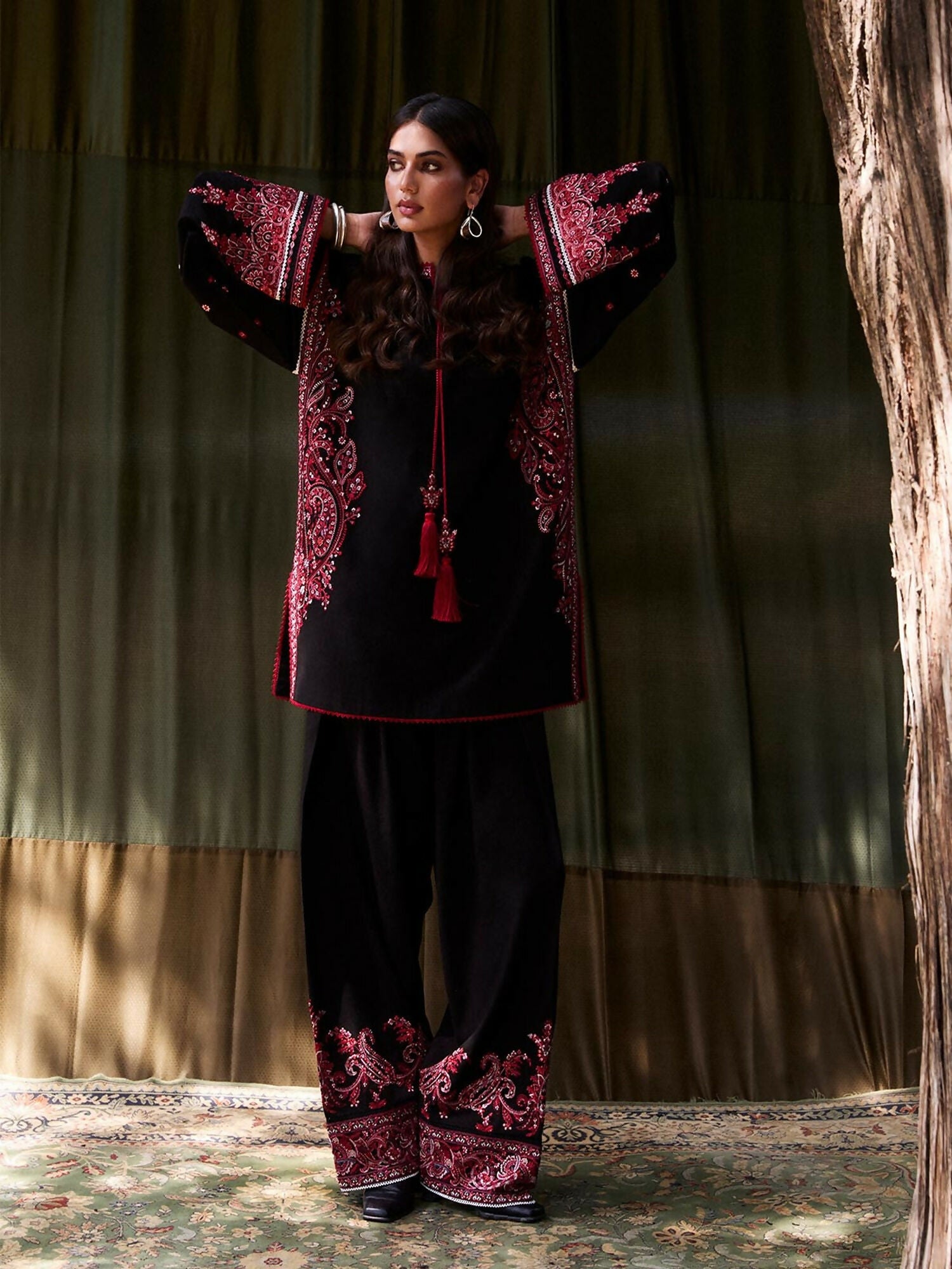 A black short shirt adorned with multicolor Kashmiri embroidery, finished with playful tassels that sway gracefully with movement. The sleeves mirror the same intricate artistry, while the matching embroidered shalwar and coordinating scarf complete the ensemble with a perfect balance of heritage and modern charm.