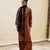A long burnt-orange karandi shirt comes alive with multicolor embroidery and delicate tassels, paired with fitted sleeves and a matching shalwar. The look is elevated with a contrasting black embroidered scarf that adds a dramatic touch to this regal ensemble.