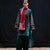 Traditional embroidery graces this mid-length green karandi shirt, featuring elegant bell sleeves finished with a contrasting black border. The matching shalwar reflects the same artisanal craft, while a zari-embroidered red scarf adds a touch of cultural richness to complete the look.