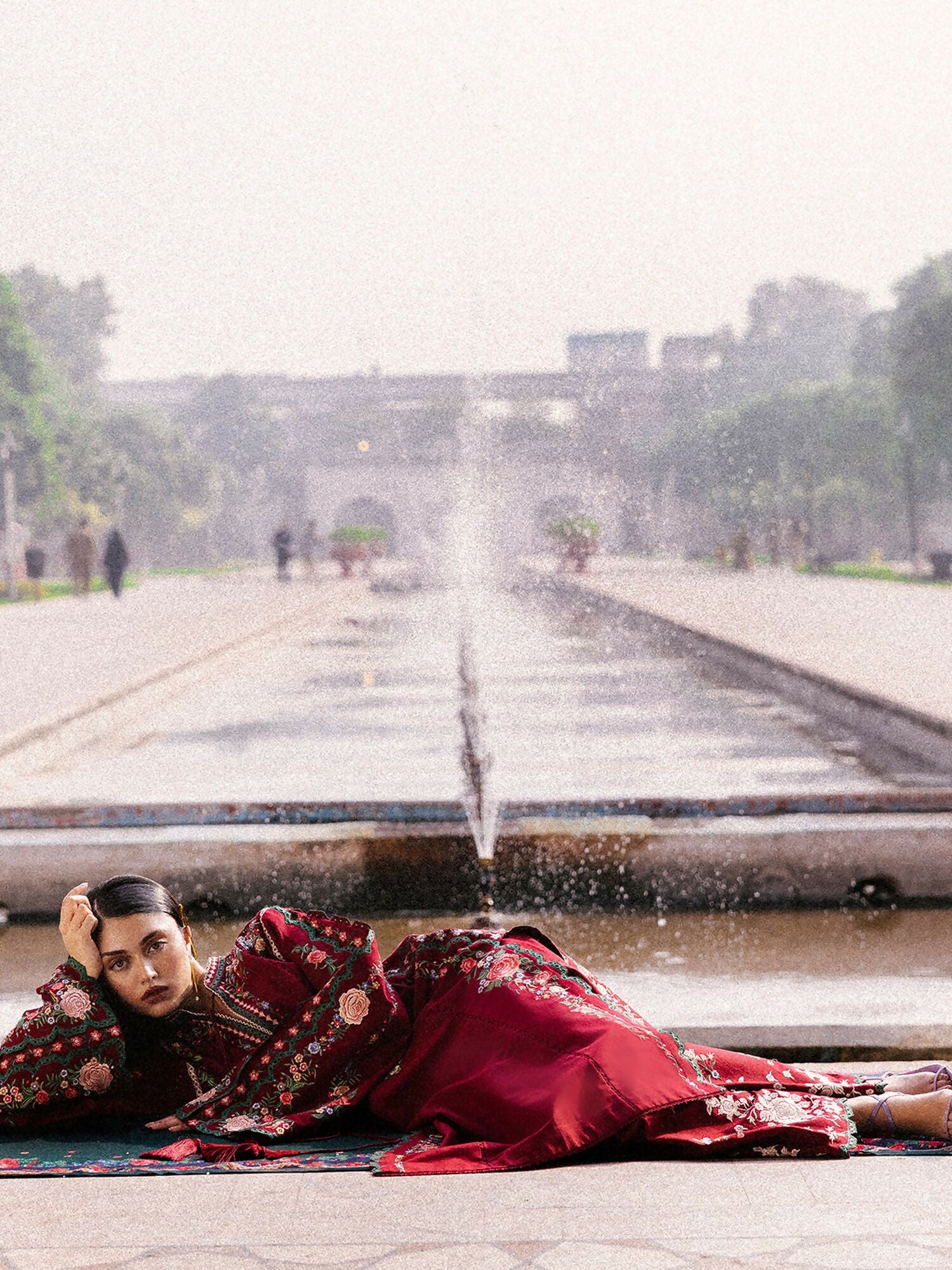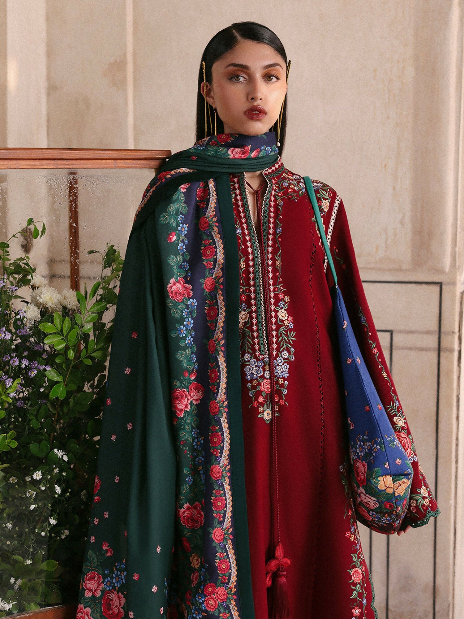 This elegant ensemble showcases a richly embroidered shirt adorned with multicolor floral motifs and intricate boring details. The matching sleeves and shalwar echo the same exquisite embroidery, creating a harmonious and refined look. Paired with a vibrant printed wool shawl featuring bold floral patterns, this outfit blends timeless charm with contemporary elegance — a signature piece that celebrates the art of timeless fashion.