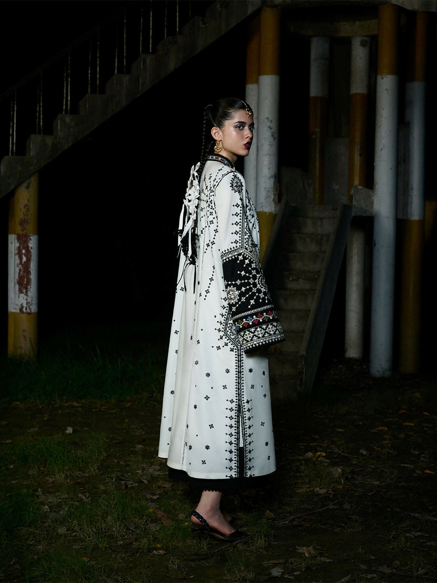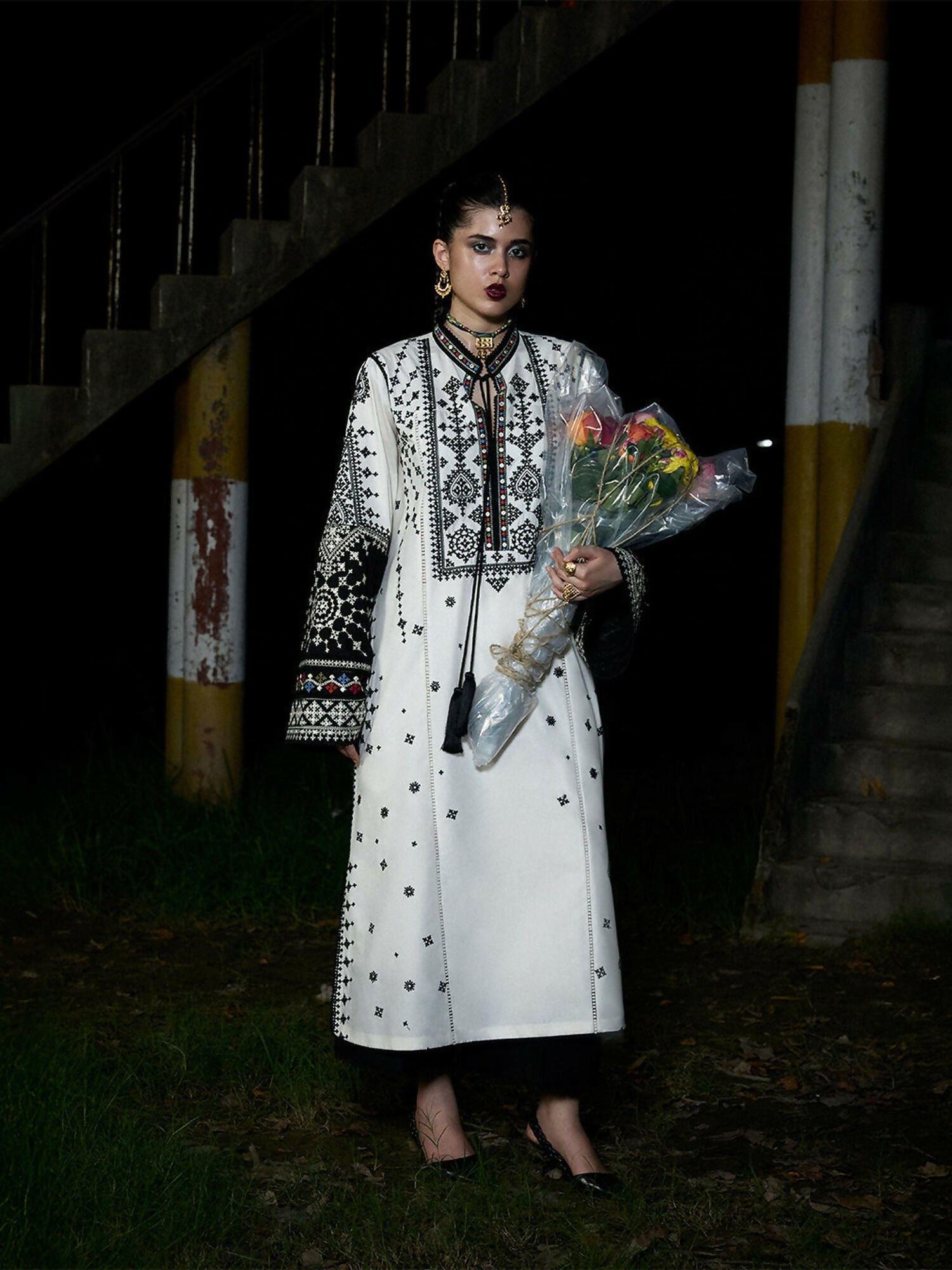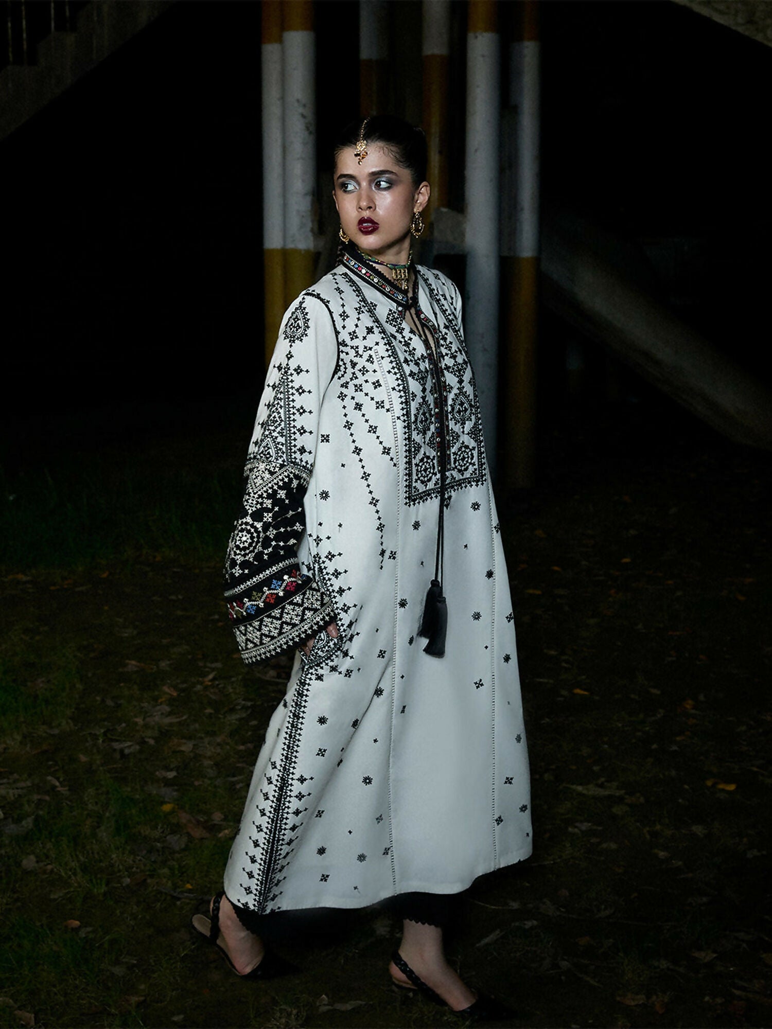 Shirt: Ivory panni-embroidered long shirt with tassel accent, long sleeves edged with black panni embroidery