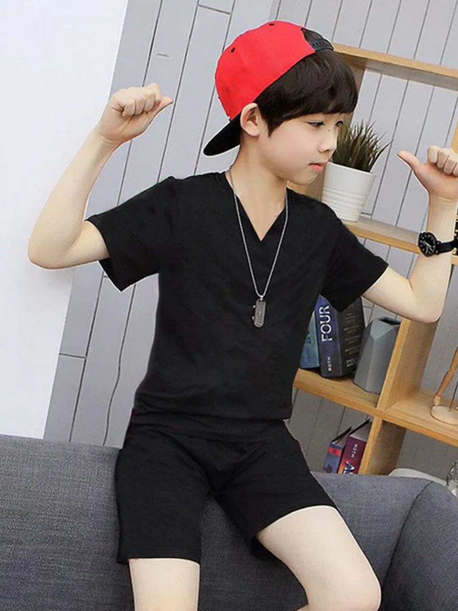 - Suitable for daily casual and fashion wear. Summer breathable fabric is used to make this quality pair suit consisting of a short and v neck tee shirt for boys.
