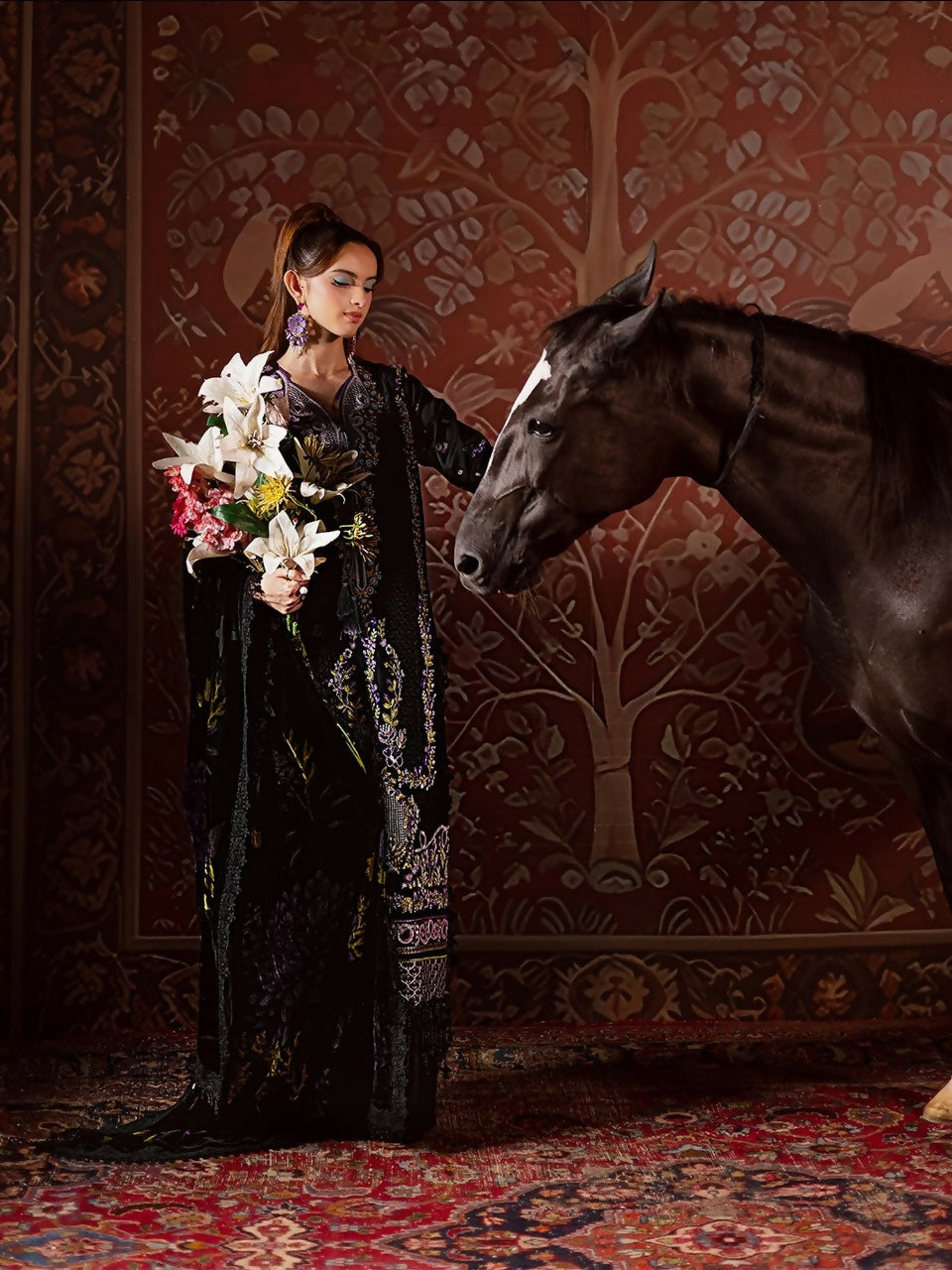 Amelia by Mahnur presents this black,multi unstitched 3-piece suit that beautifully blends luxury and seasonal style. The kotrai shirt features a richly embroidered front and coordinating embroidered sleeves. The ensemble is further elevated by intricate embroidered borders on silk and organza, adding a touch of refined artistry to the overall look. It is paired with a soft palchi shawl and a dyed trouser, creating an elegant and comfortable outfit for any special occasion.