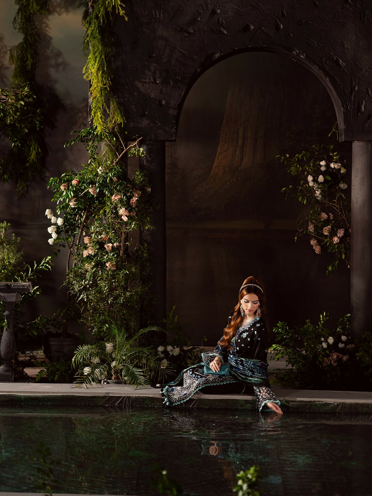 Amelia by Mahnur presents this black unstitched 3-piece suit that beautifully blends luxury and seasonal style. The kotrai shirt features a richly embroidered front and embroidered sleeves. The ensemble is further elevated by multiple intricate embroidered elements: a border on organza, a special pati for the sides and front, and a separate daman for the hemline. It is paired with a soft palachi shawl and a dyed trouser, creating an elegant and comfortable outfit for any special occasion.