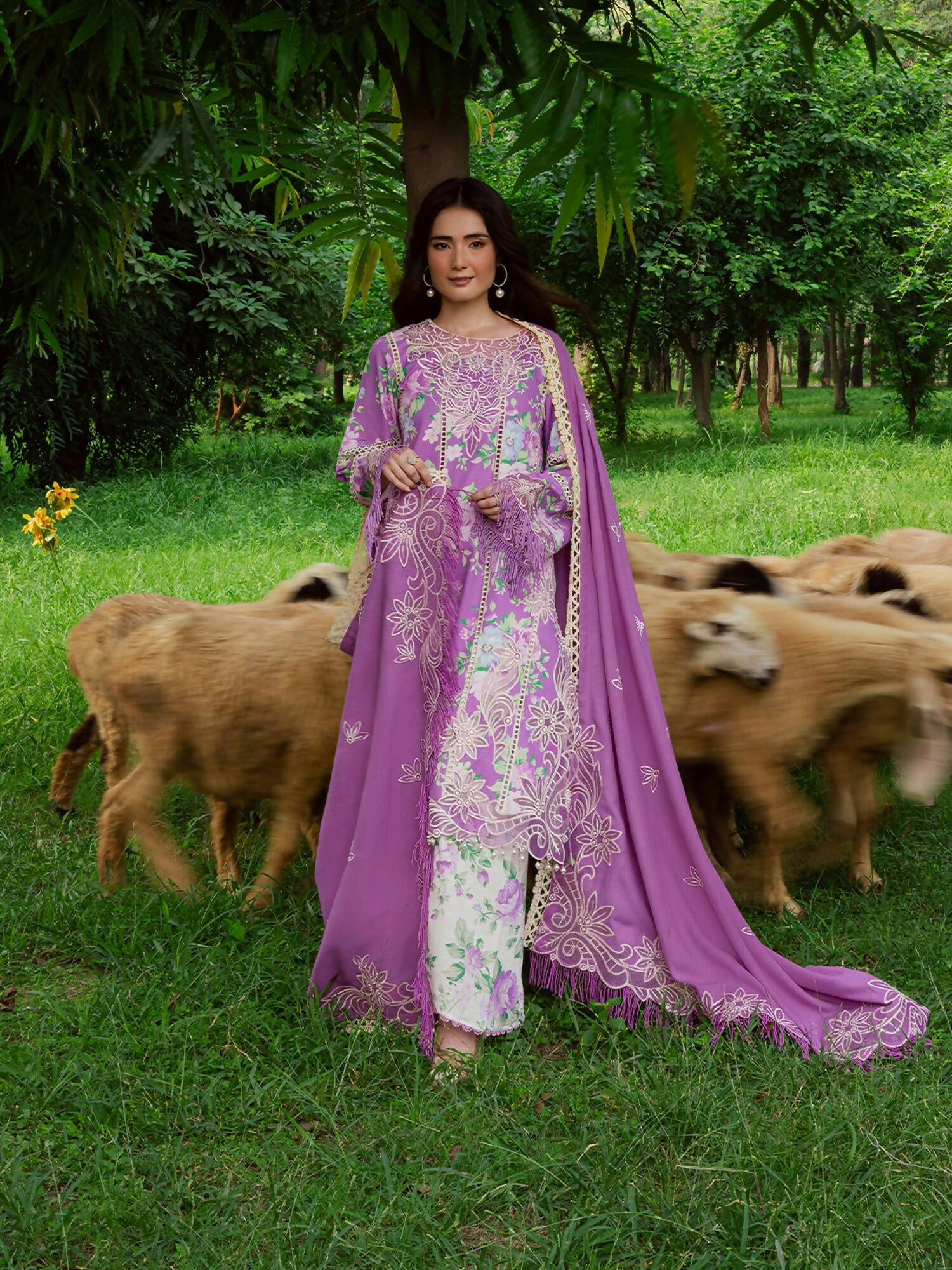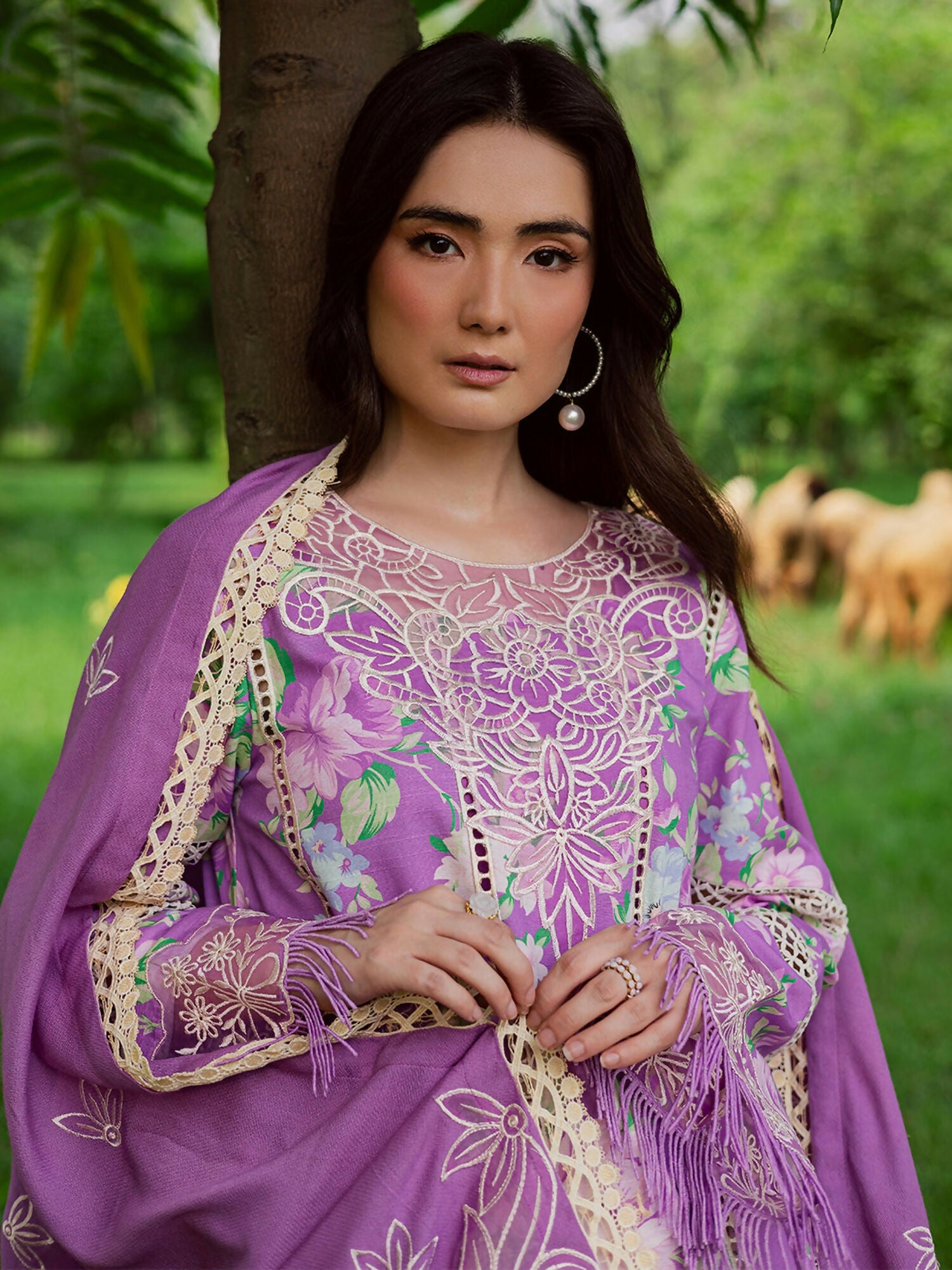 Celebrate winter elegance with this unstitched 3-piece khaddar suit, designed with refined prints and intricate embroidery. The khaddar shirt features a printed and embroidered front, printed back and sleeves, an embroidered neckline, embroidered border, and embroidered motifs for daman and overall design. Paired with a luxurious embroidered wool shawl and a printed trouser, this ensemble blends comfort and sophistication perfectly.