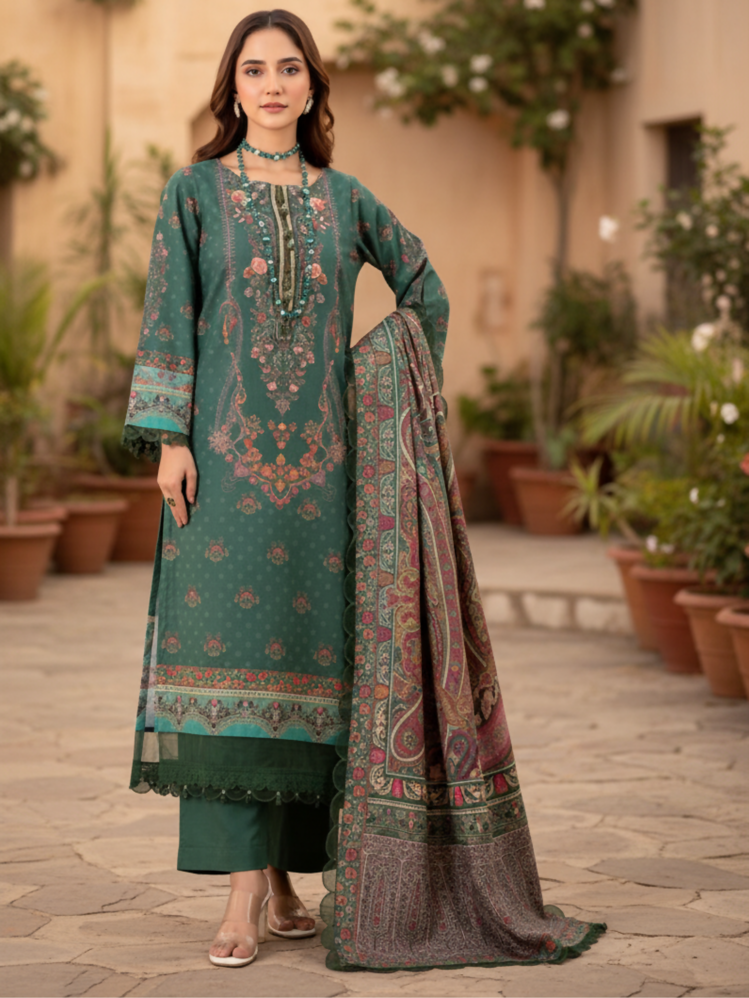 Embrace cozy elegance this winter with this 3-piece unstitched khaddar digital suit, designed for comfort and warmth. The digital printed khaddar shirt reflects refined craftsmanship, perfectly complemented by a digital printed khaddar dupatta. The plain khaddar trouser completes the look, making this outfit ideal for stylish everyday wear in the colder season.
