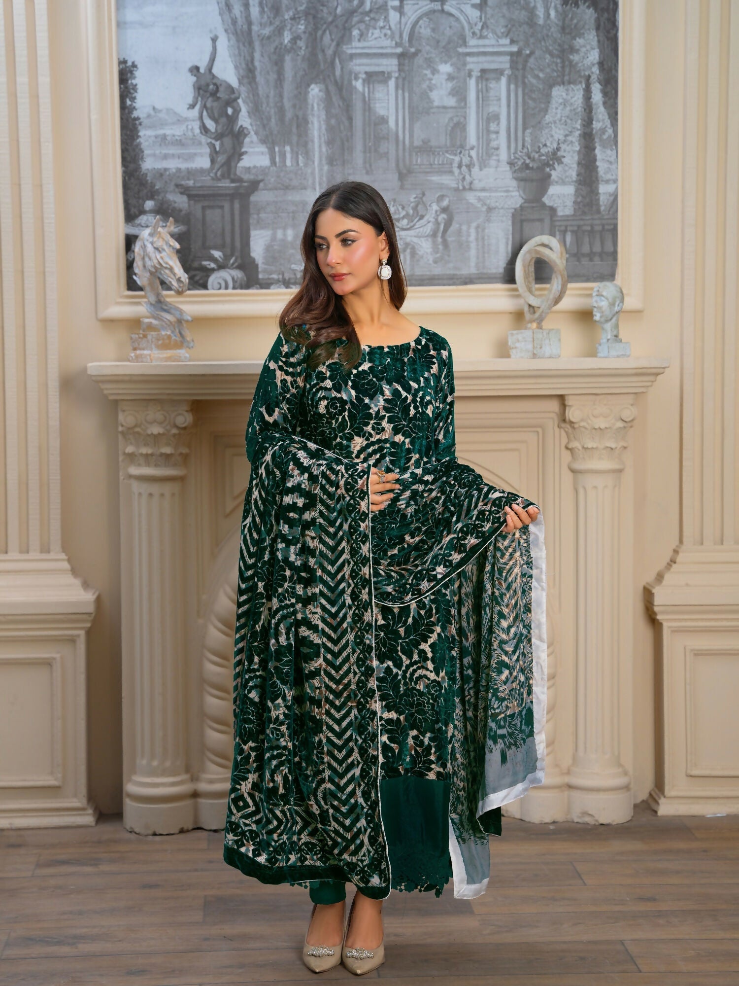 An elegant festive outfit designed in palachi velvet with embossed printing, perfect for winter celebrations. The richly textured shirt and matching velvet dupatta bring refined charm, while the dyed raw silk trouser completes the look with sophistication.