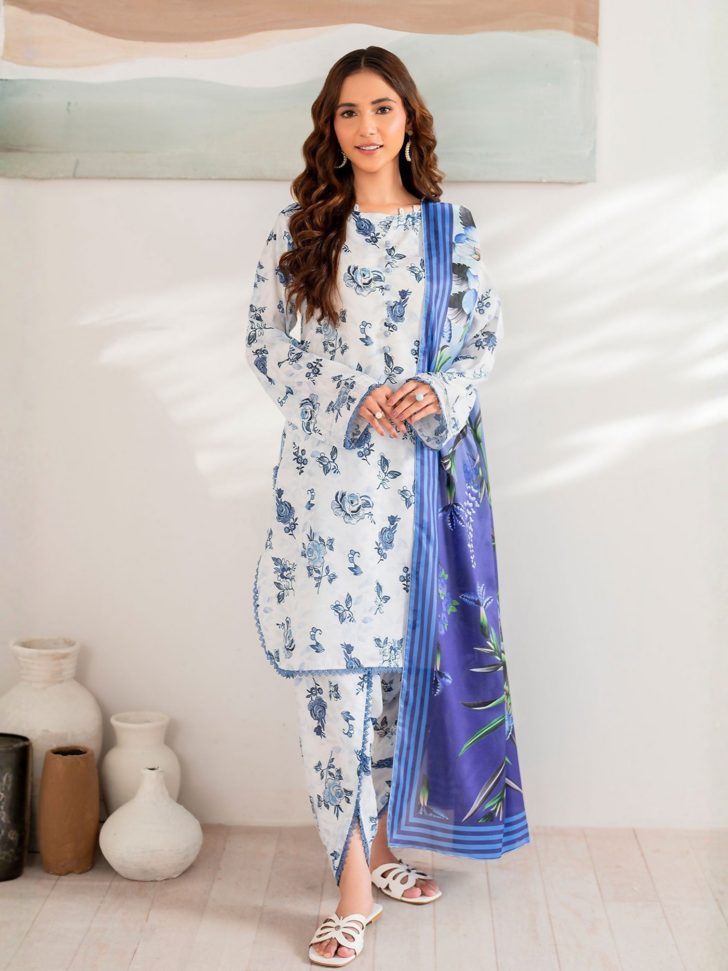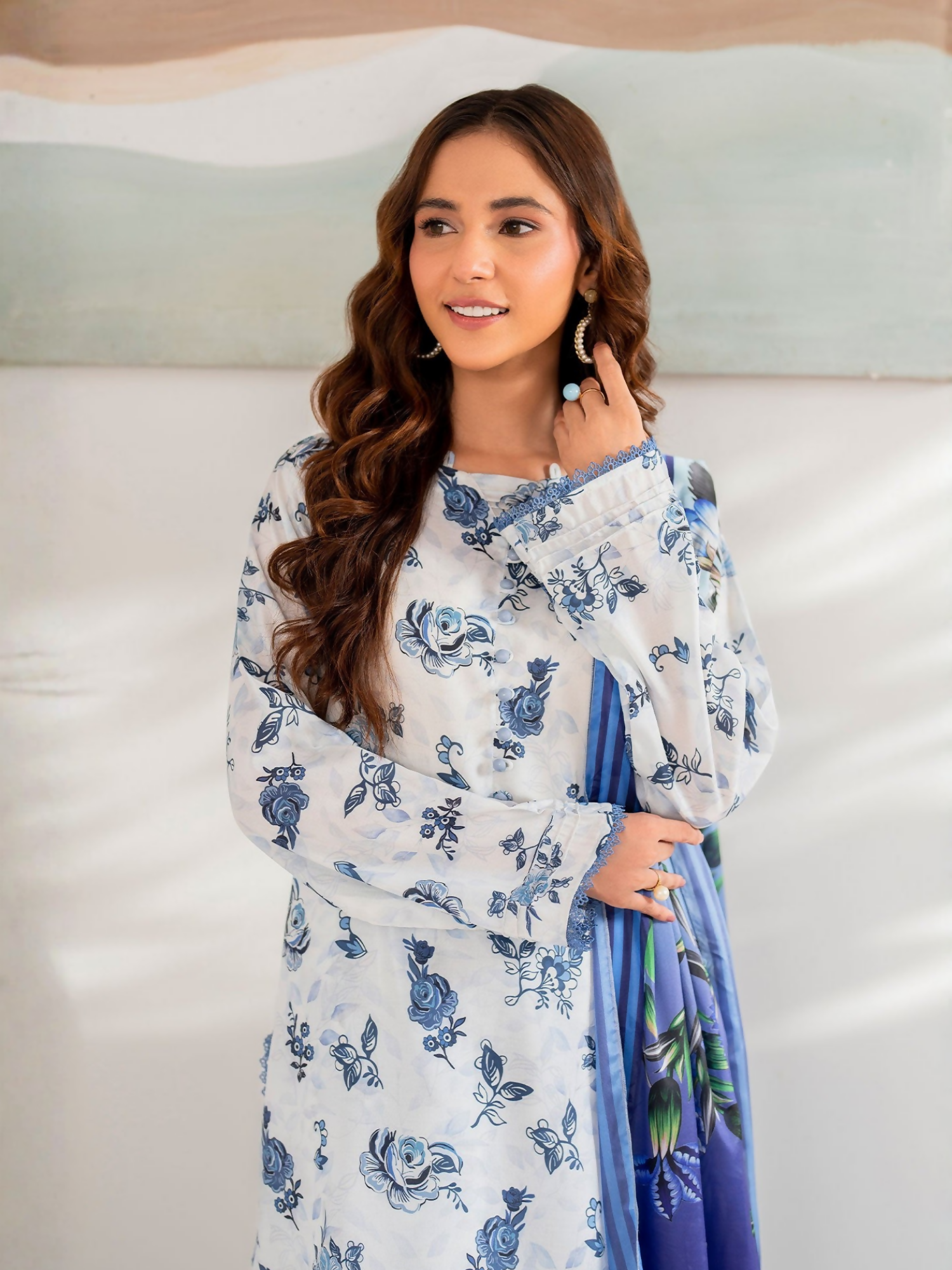 A beautifully crafted cambric ensemble in refreshing white and blue tones, featuring digital prints and delicate lace embellishments. Paired with a chic tulip trouser and a vibrant silk dupatta, this outfit offers a perfect blend of comfort, style, and modern elegance.